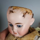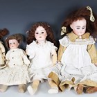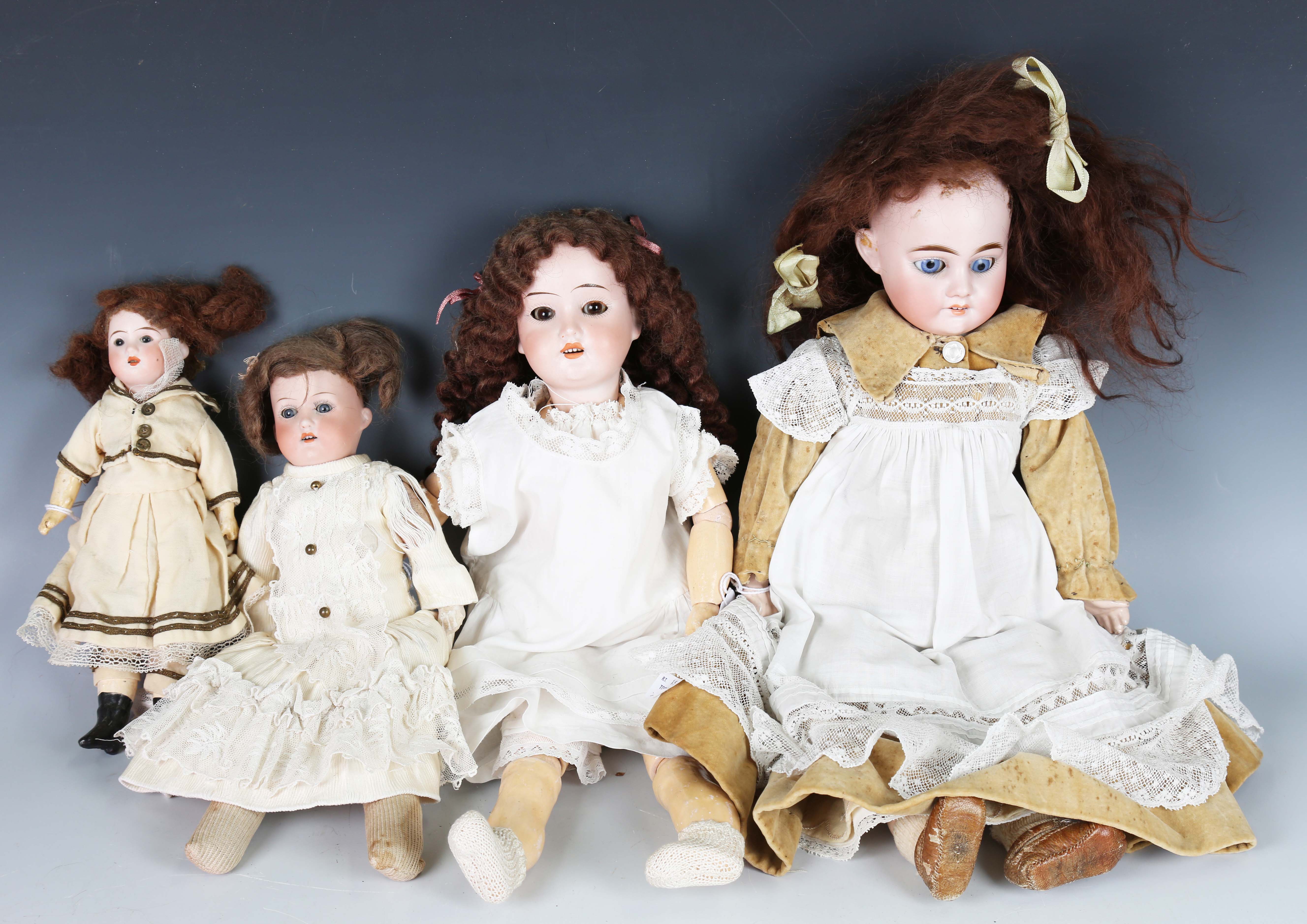 Four German bisque socket head dolls, comprising Armand Marseille, impressed '13½ DEP', with later brown wig and sleeping blue eyes, height 45cm, Schoenau & Hoffmeister PB, impressed '1909 0', with brown wig and fixed brown eyes, height 42cm, German doll, impressed '12', with brown wig and fixed brown eyes, height 24cm, and Heubach Köppelsdorf bisque head and shoulders doll, impressed '275 14/0', with brown wig and sleeping blue eyes, height 32cm (eyelids damaged), all clothed (some playwear and fingers missing).