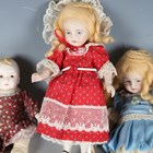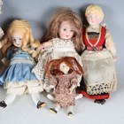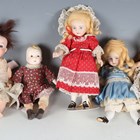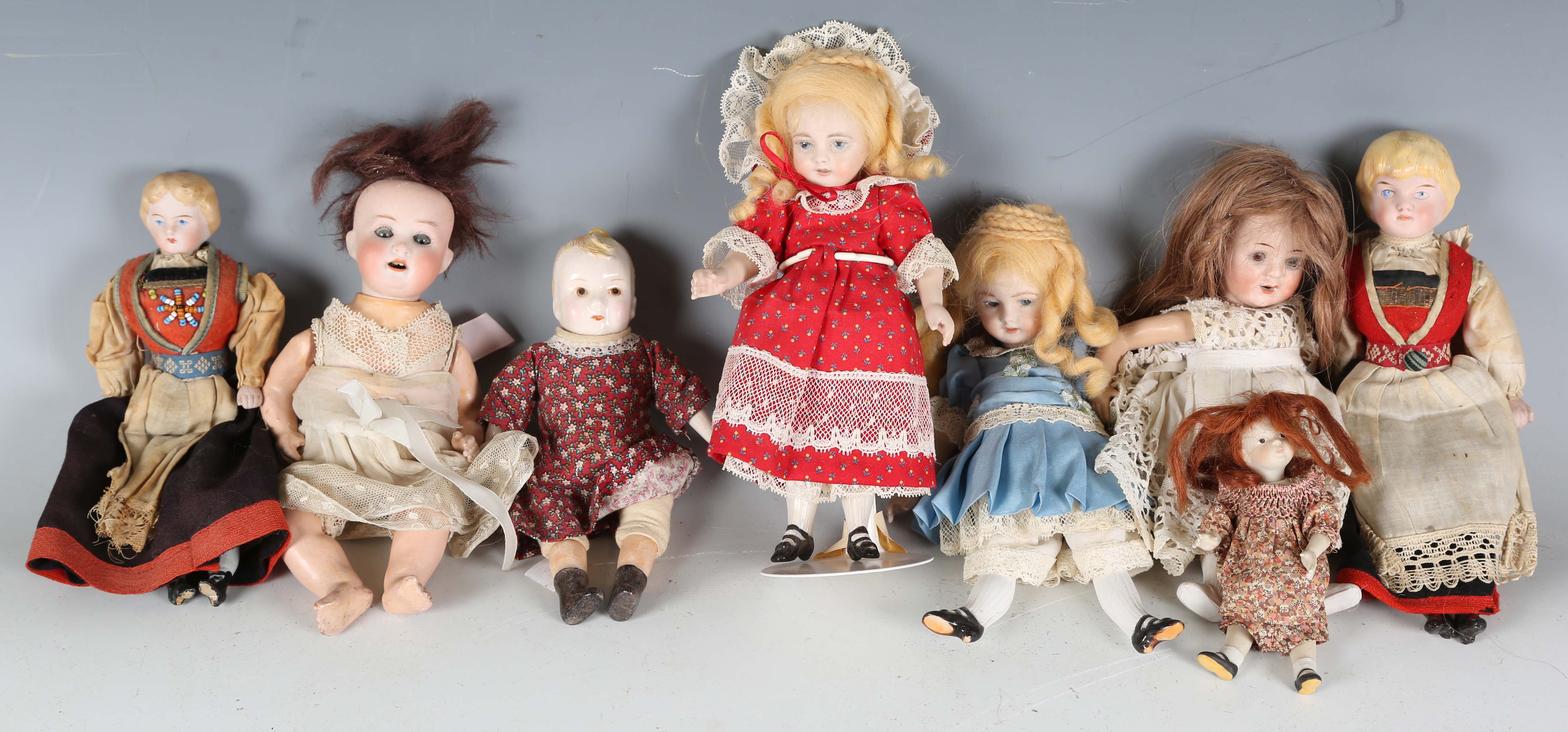 A German bisque head and shoulder doll with moulded glazed blonde hair, painted features and cloth body with bisque lower limbs, height 21cm, together with a similar doll, height 19cm, four other bisque head dolls, a doll with glazed head and arms, and a modern all-bisque doll's house doll.