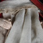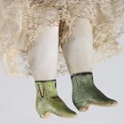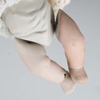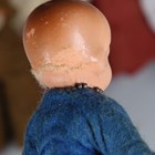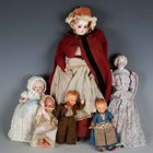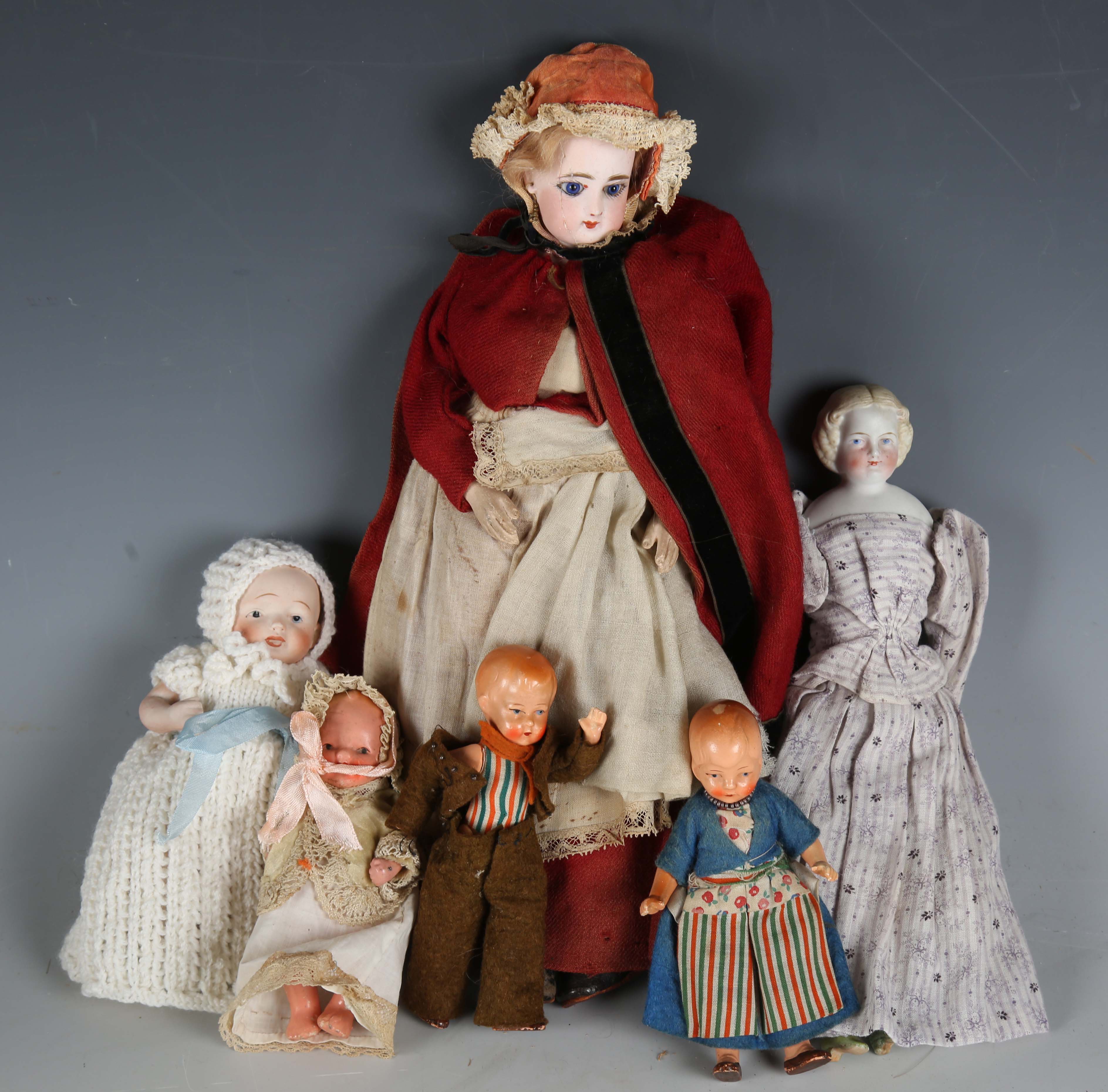 A bisque socket head doll with blue glass eyes, painted features and cloth body with composition lower arms, height 31cm (head cracked), a bisque head and shoulders doll with fabric body and bisque lower limbs, height 24cm, a Japanese all-bisque baby doll, height 15cm (right ankle damaged), and three doll’s house dolls.