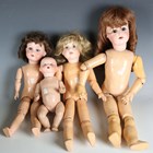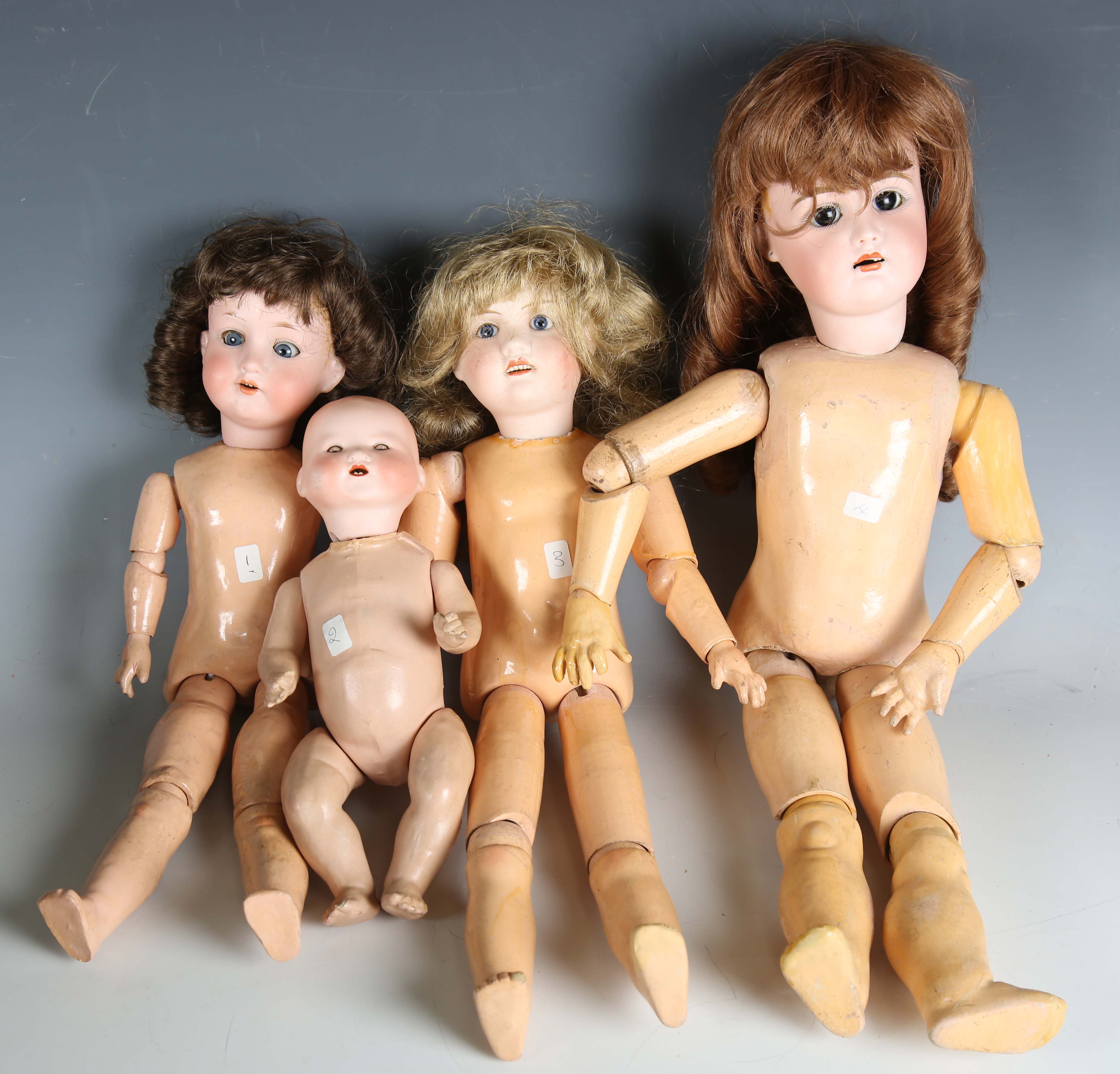 Four bisque socket head dolls, comprising Armand Marseille, impressed ‘390 A0½M’, with later brown wig, height 40cm, Dream Baby doll, height 27cm, Jules Verlingue girl doll with later blonde wig, height 43cm (head cracked), and German girl doll with brown wig, height 52cm (head cracked and repaired), all with composition bodies, together with a collection of christening and other gowns.