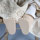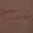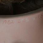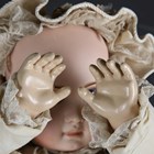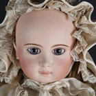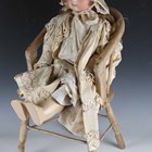 A Gina Saunders Jumeau style bisque head doll, signed and dated 1992, with blonde wig, fixed blue glass paperweight eyes, feather brows, eyelashes, closed mouth, pierced ears and jointed composition body, height 77cm, wearing a silk hat, lace-edged cape, cotton dress, undergarments and socks, together with a child’s/doll’s chair on turned legs.
