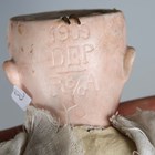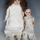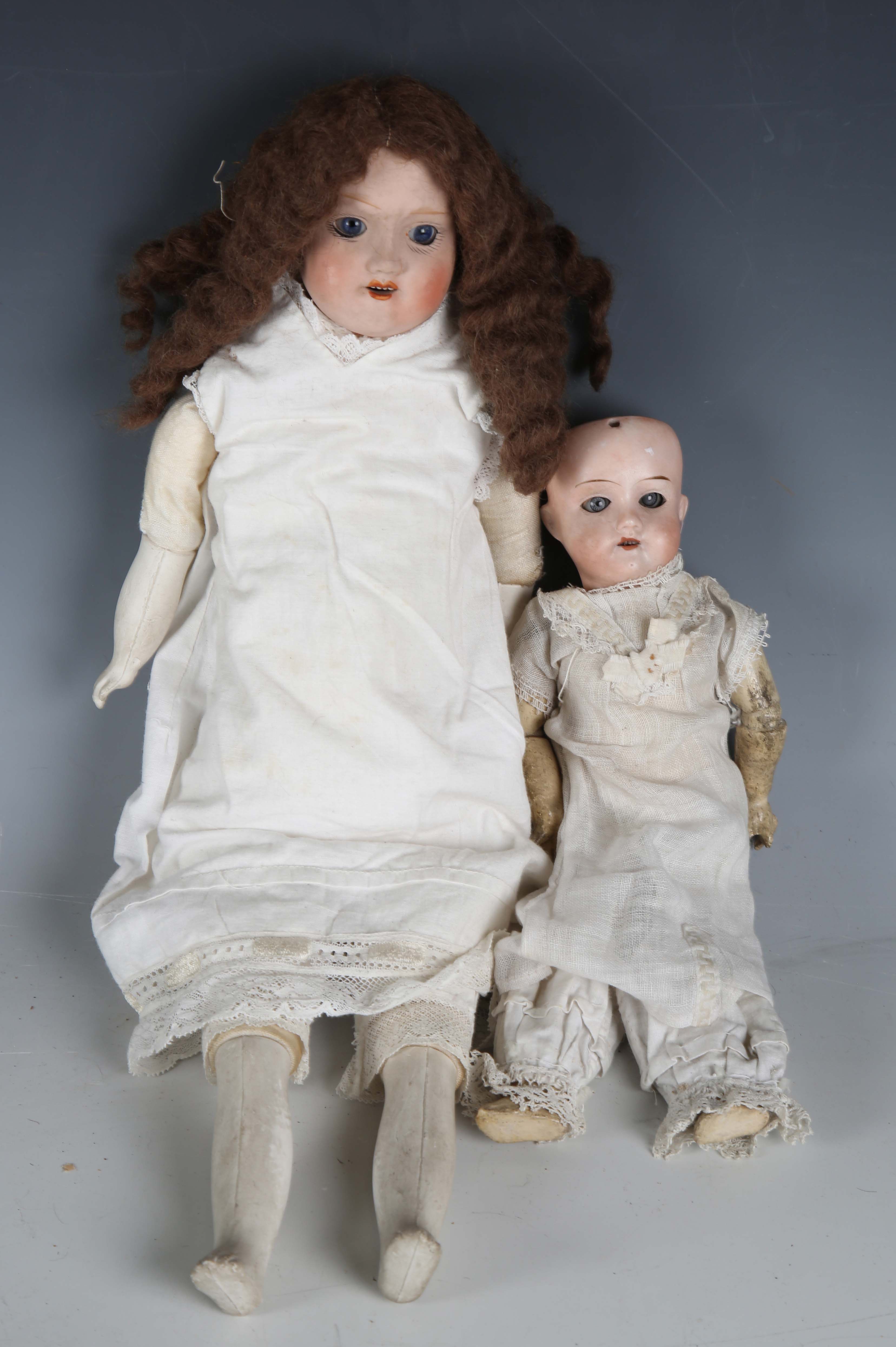 A bisque head and shoulders doll, impressed ‘DPC 19-7’, with brown wig, fixed blue glass eyes, open mouth, painted features and fabric body with bisque lower limbs, height 47cm, together with a bisque head doll, impressed ‘1909 DEP R 8/0A’, with sleeping blue eyes, open mouth and jointed composition body, height 28cm, both clothed.