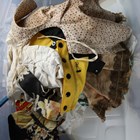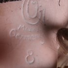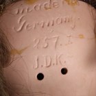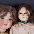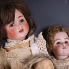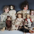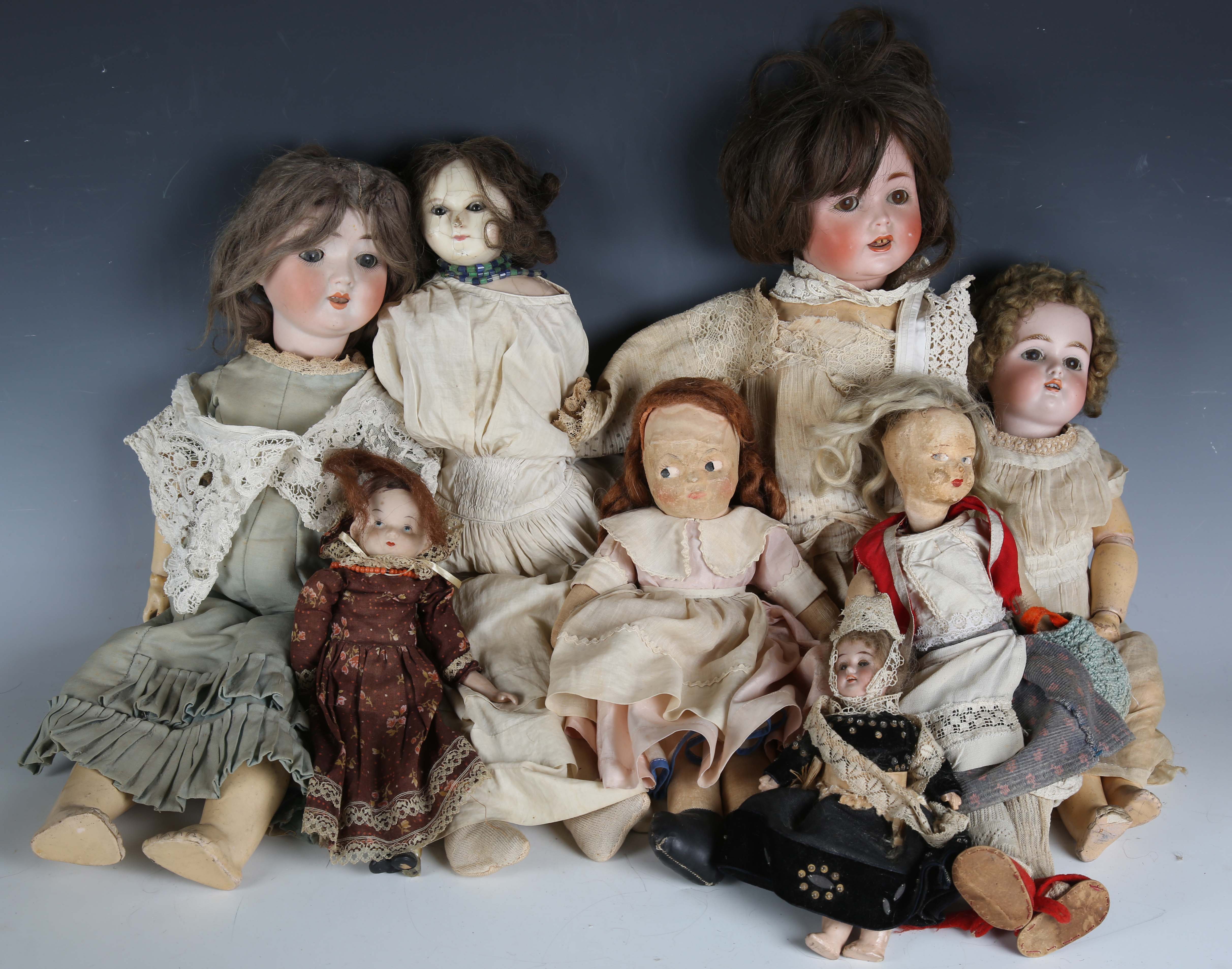 A 19th century wax-over-composition doll with brown fixed glass eyes, painted mouth and fabric body, height 54cm, together with four German bisque head dolls, each with composition bodies, another bisque head doll, two fabric dolls, a 19th century silk and needlework doll's dress and other dolls' clothes (faults and parts missing).