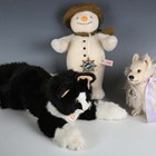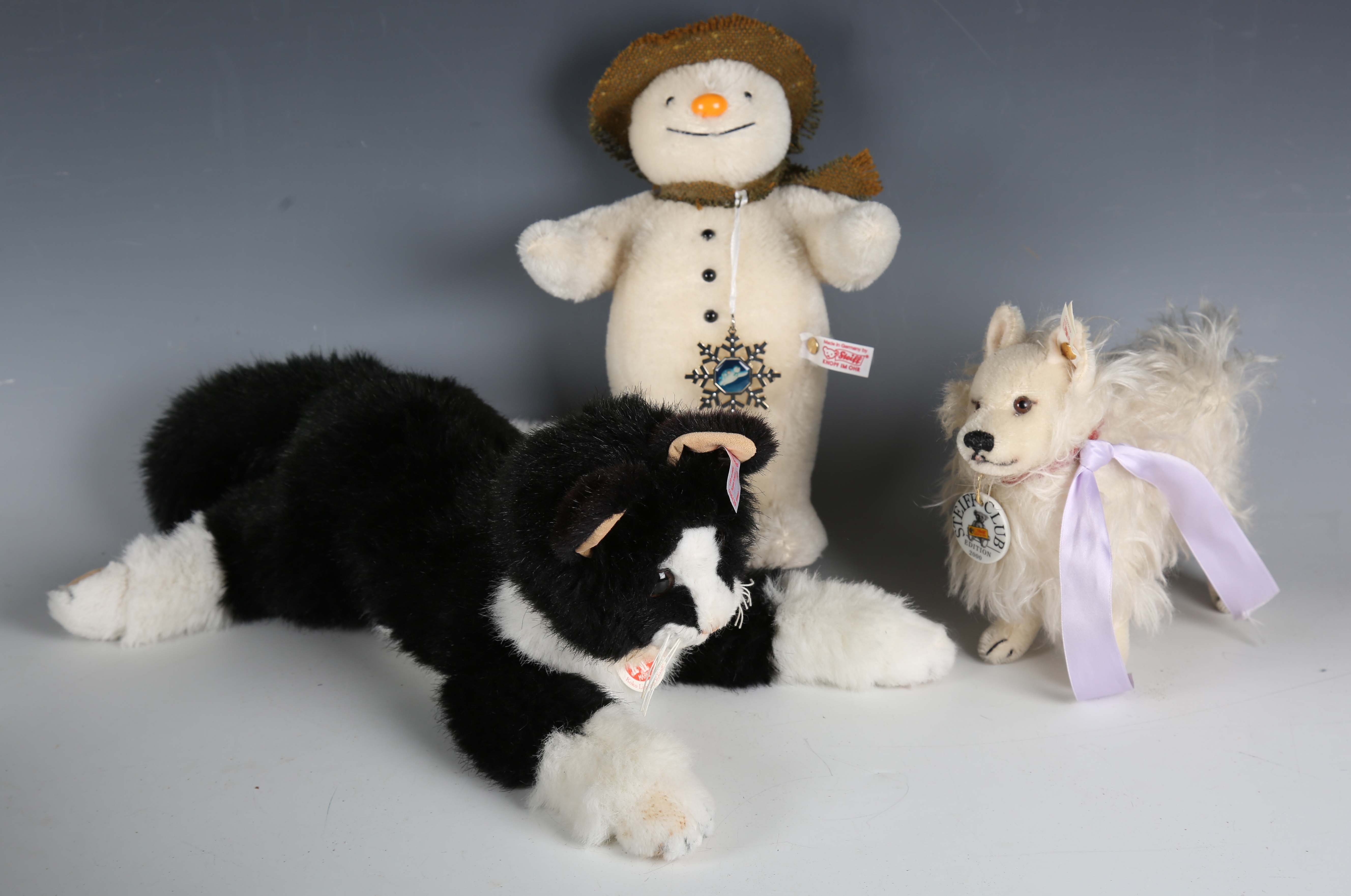 Three modern Steiff limited edition soft toys, comprising Club Edition 2000 dog with badge, No. 663826 Snowman and No. 036439 Koko Katze (no certificates or boxes).
