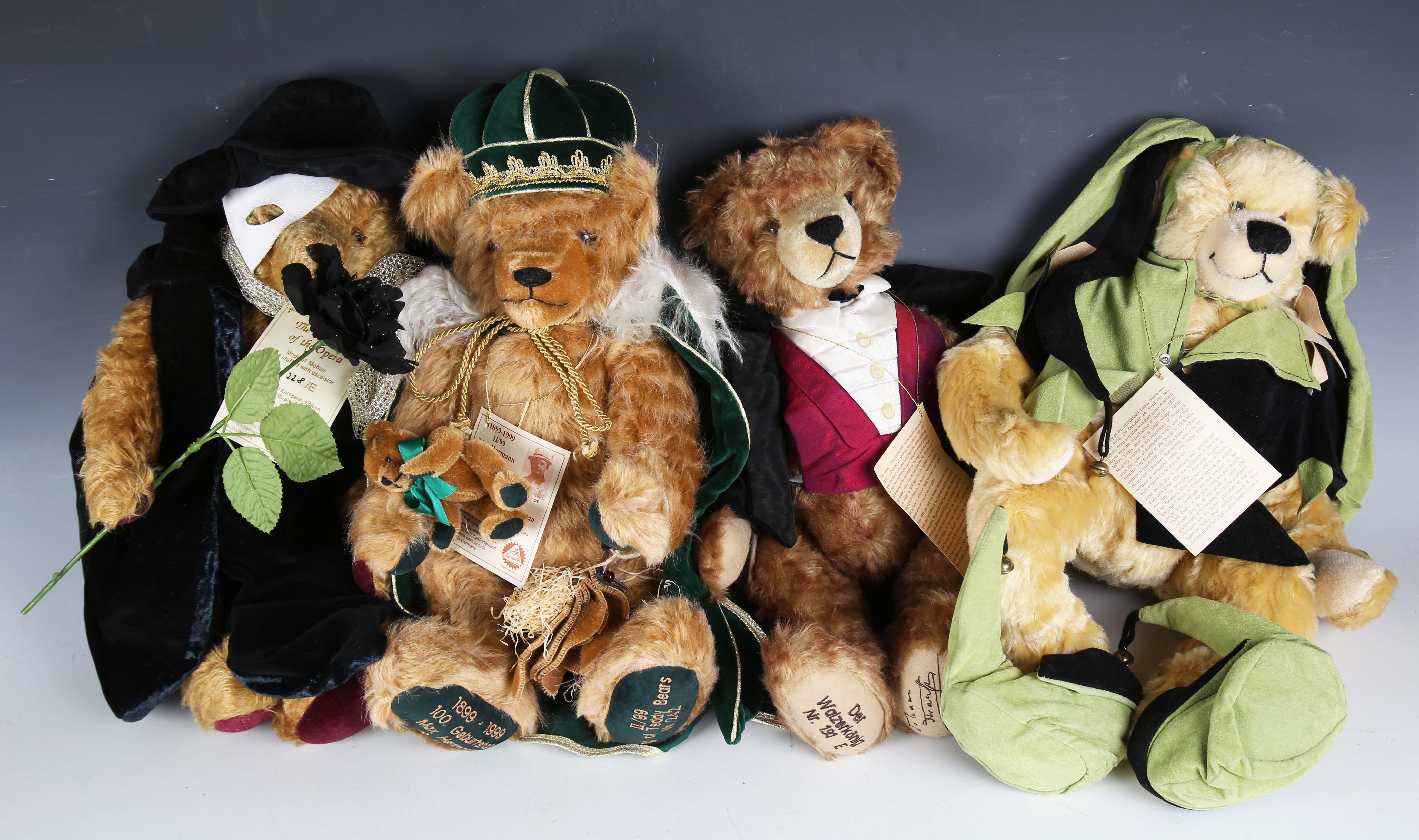 Four Hermann limited edition teddy bears, comprising Max Hermann King of Teddybears, 242/1000, Johann Strauss, 191/500, Jester-Bear, 141/500, and The Phantom of the Opera, 228/500.