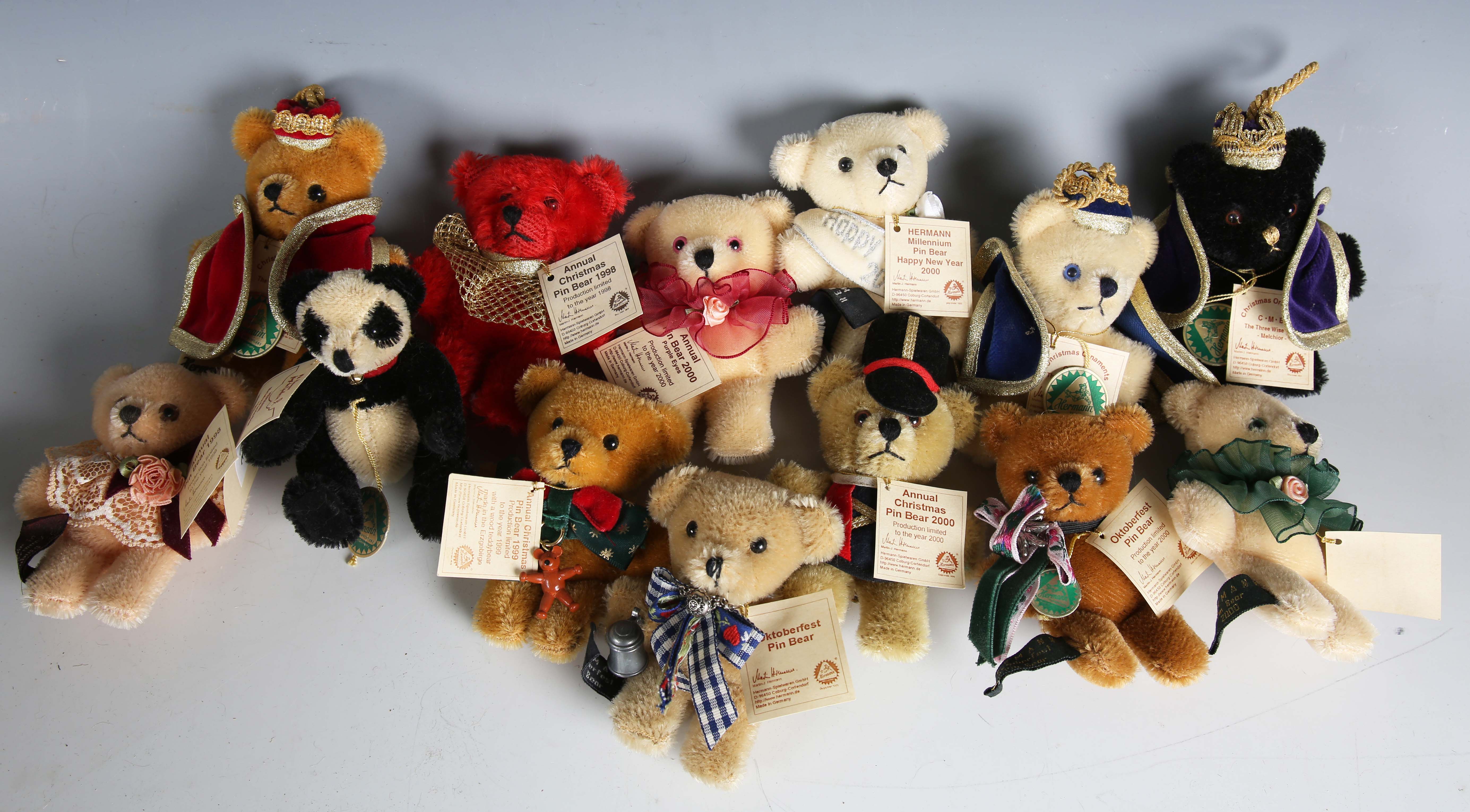 Nine Hermann Pin Bears, together with The Three Wise Men Christmas ornament bears and a Panda Bear, No. 491/500.