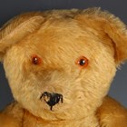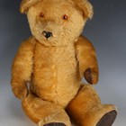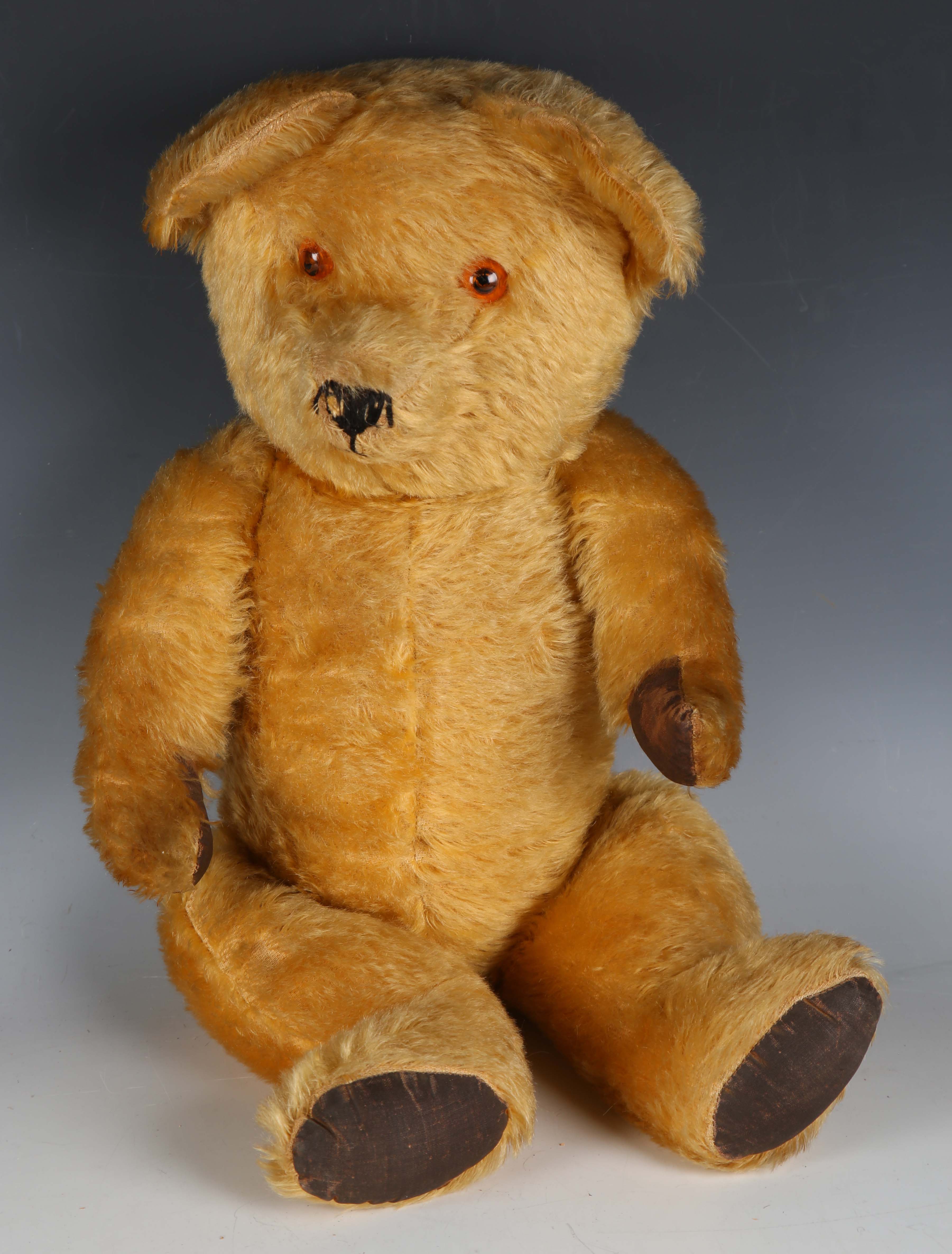 A mid-20th century mohair teddy bear with amber and black eyes, stitched vertical nose, jointed body and original musical mechanism, height 55cm (wear).