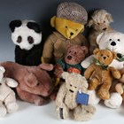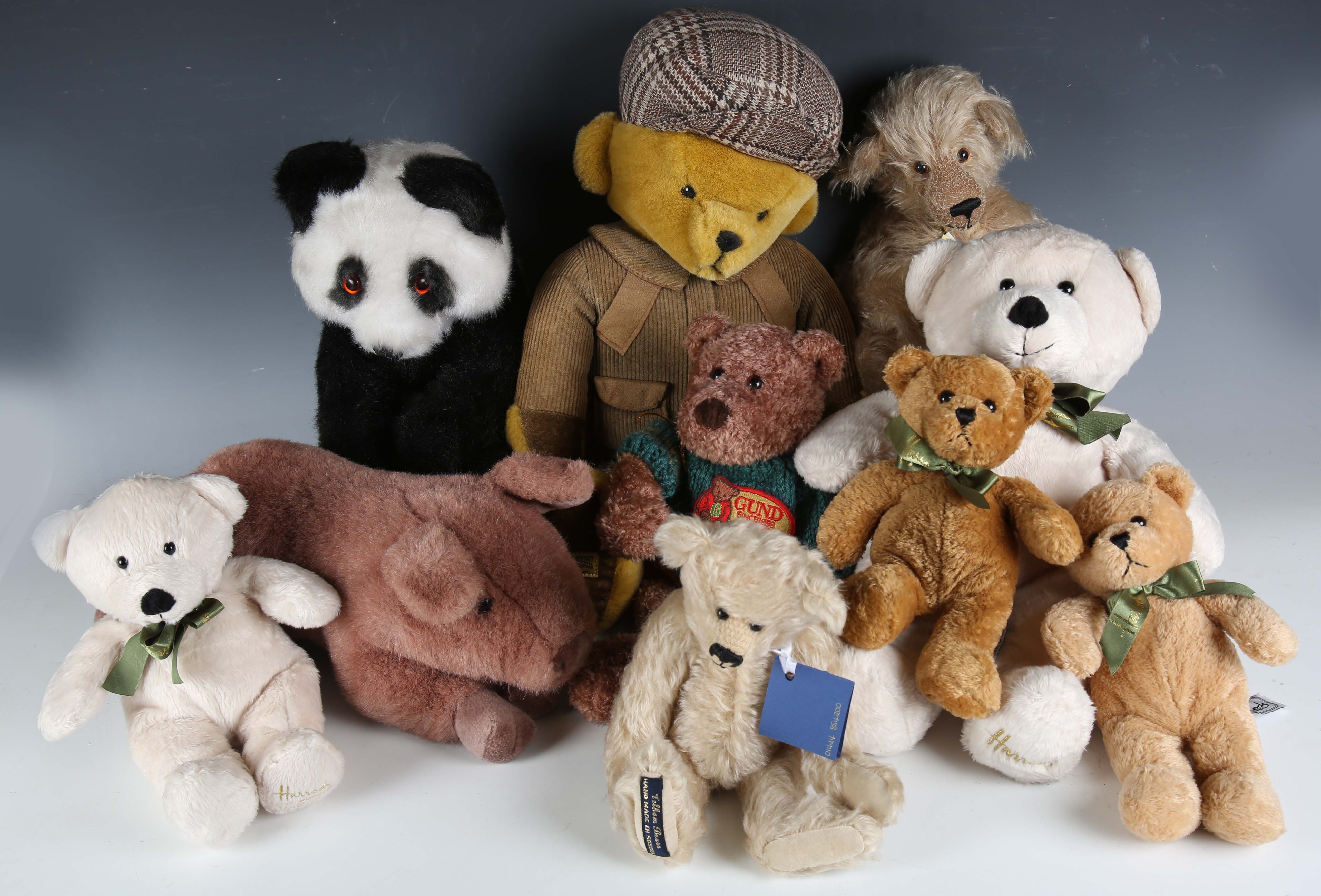 A group of modern teddy bears, including Merrythought Millenium bear, Panda Bear, four Harrod's bears, Gund 100 Years bear and soft toy pig, Hermann Monty limited edition bear, 682/2000, with certificate, and Telham Bears artist bear.