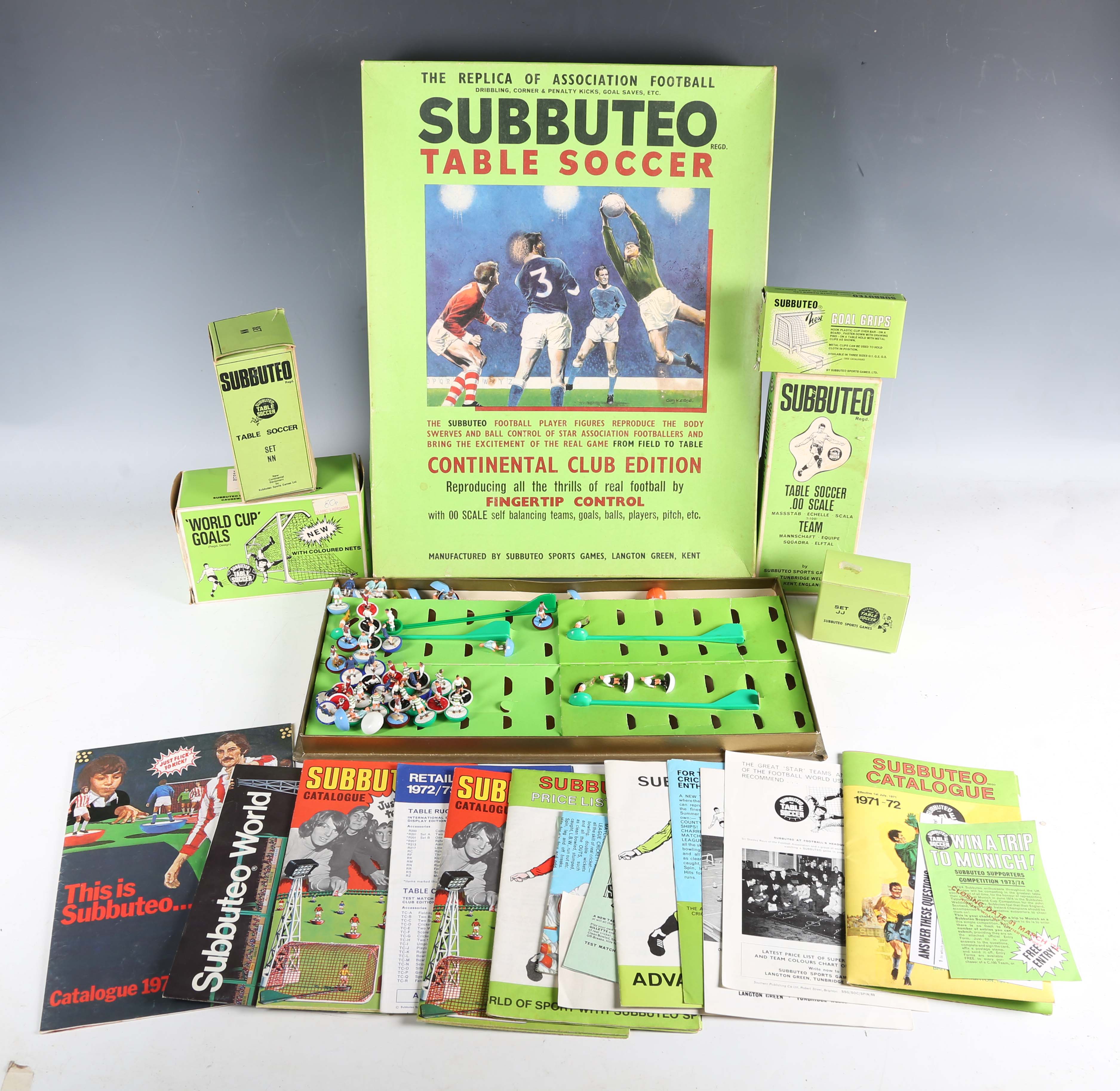 A Subbuteo Club Edition set with two teams, pitch and football, boxed, together with a group of other teams, World Cup, goals, ball raising chute, interlocking fences, goal grips and other accessories and figures.
