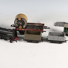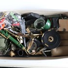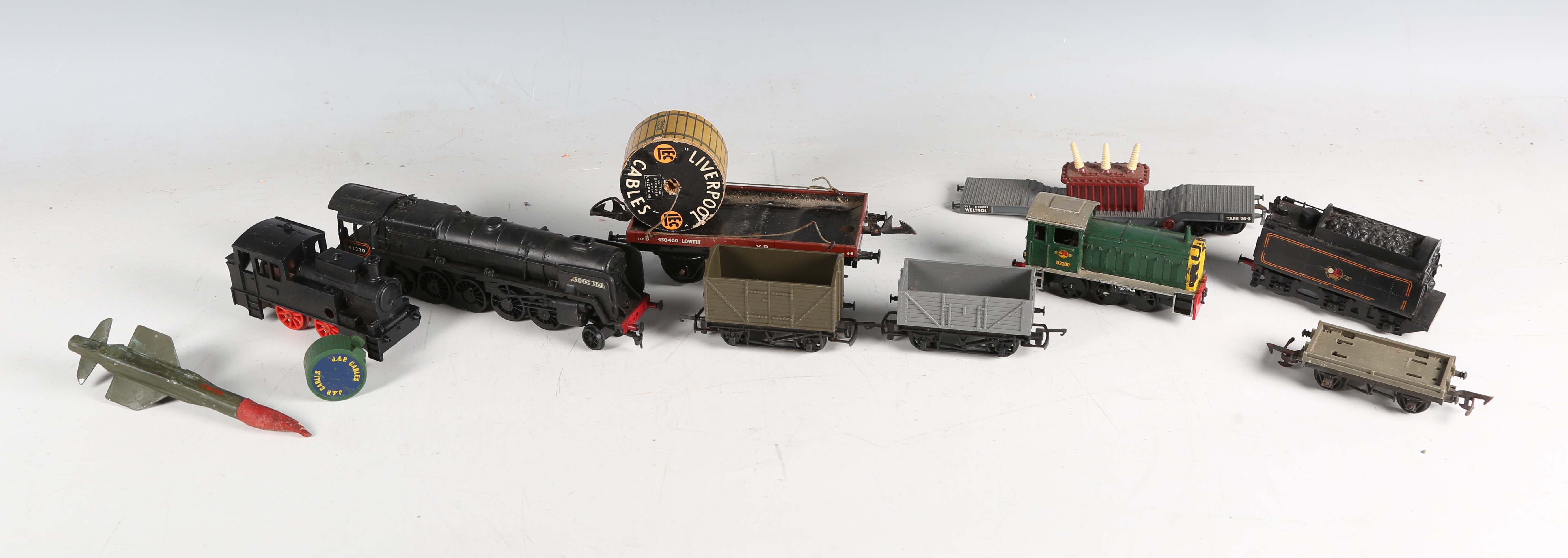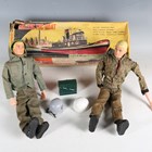 Two Palitoy Action Man figures with plastic blond hair and firm hands (one right arm detached), together with a collection of Action Man accessories, a Sunrise Toys battery operated smoking tug boat, boxed, and a small group of OO gauge model railway items (playwear, tug boat box torn).