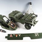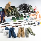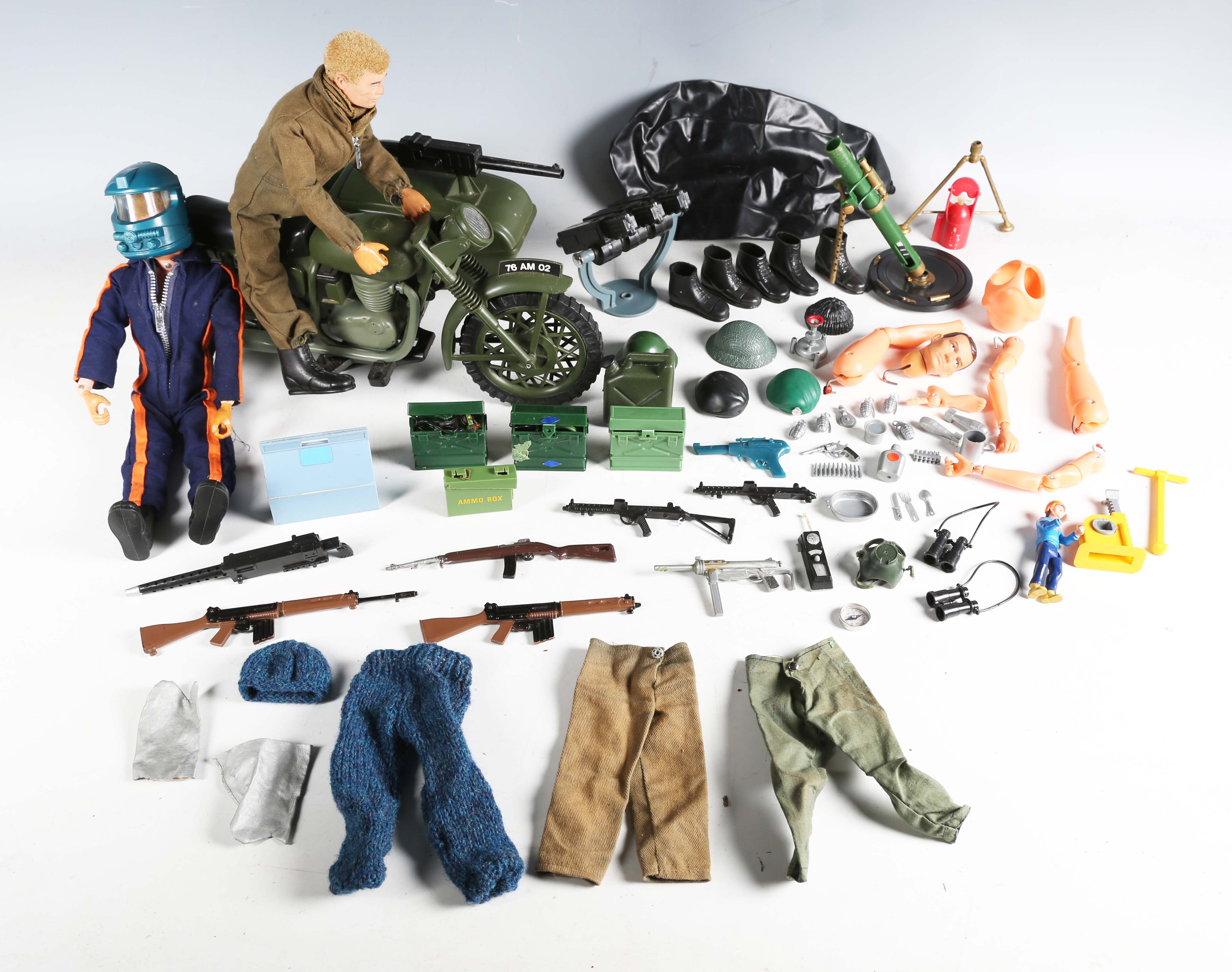 A collection of Palitoy Action Man items, including Action Man figure with eagle eyes, flock hair and gripping hands, another with flock hair and gripping hands, clothes, accessories, motorcycle and side car, Jeep and helicopter parts (playwear and faults).