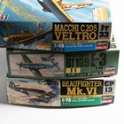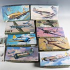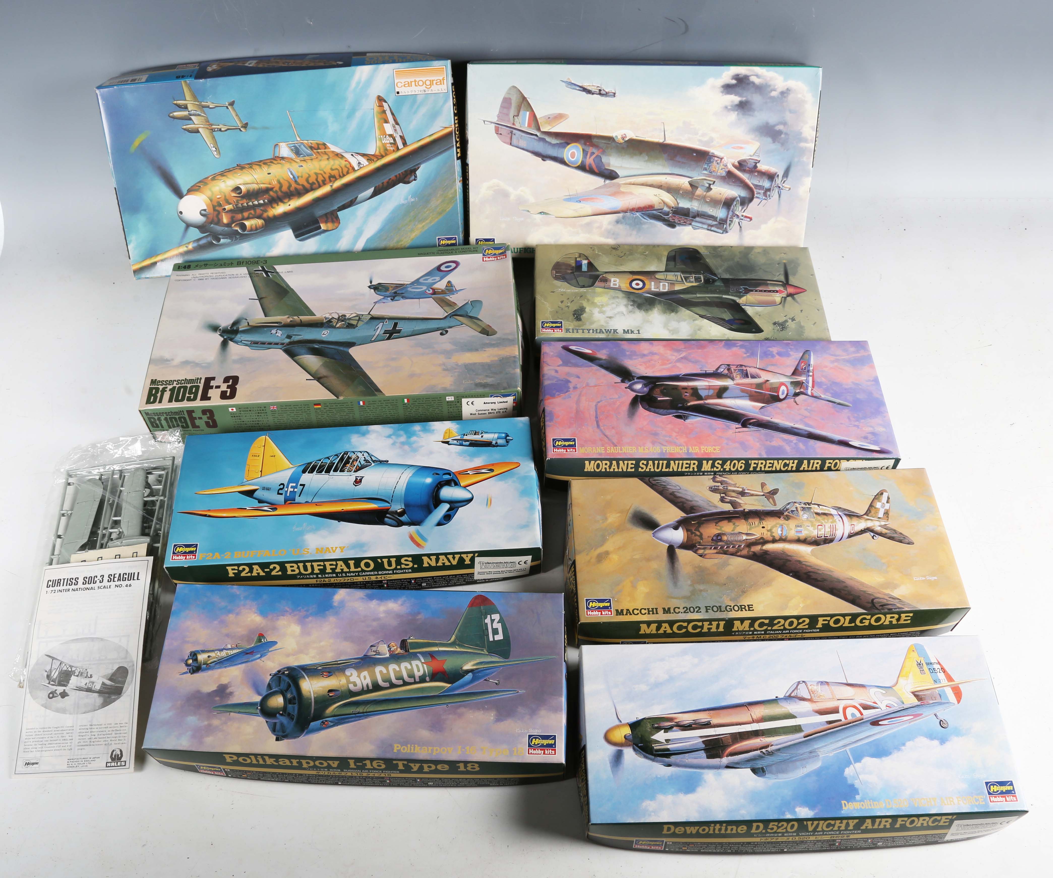 Ten Hasagawa plastic model aircraft kits, including Messerschmitt Bf109, Beaufighter Mk.VI and Kittyhawk Mk.I, all boxed.