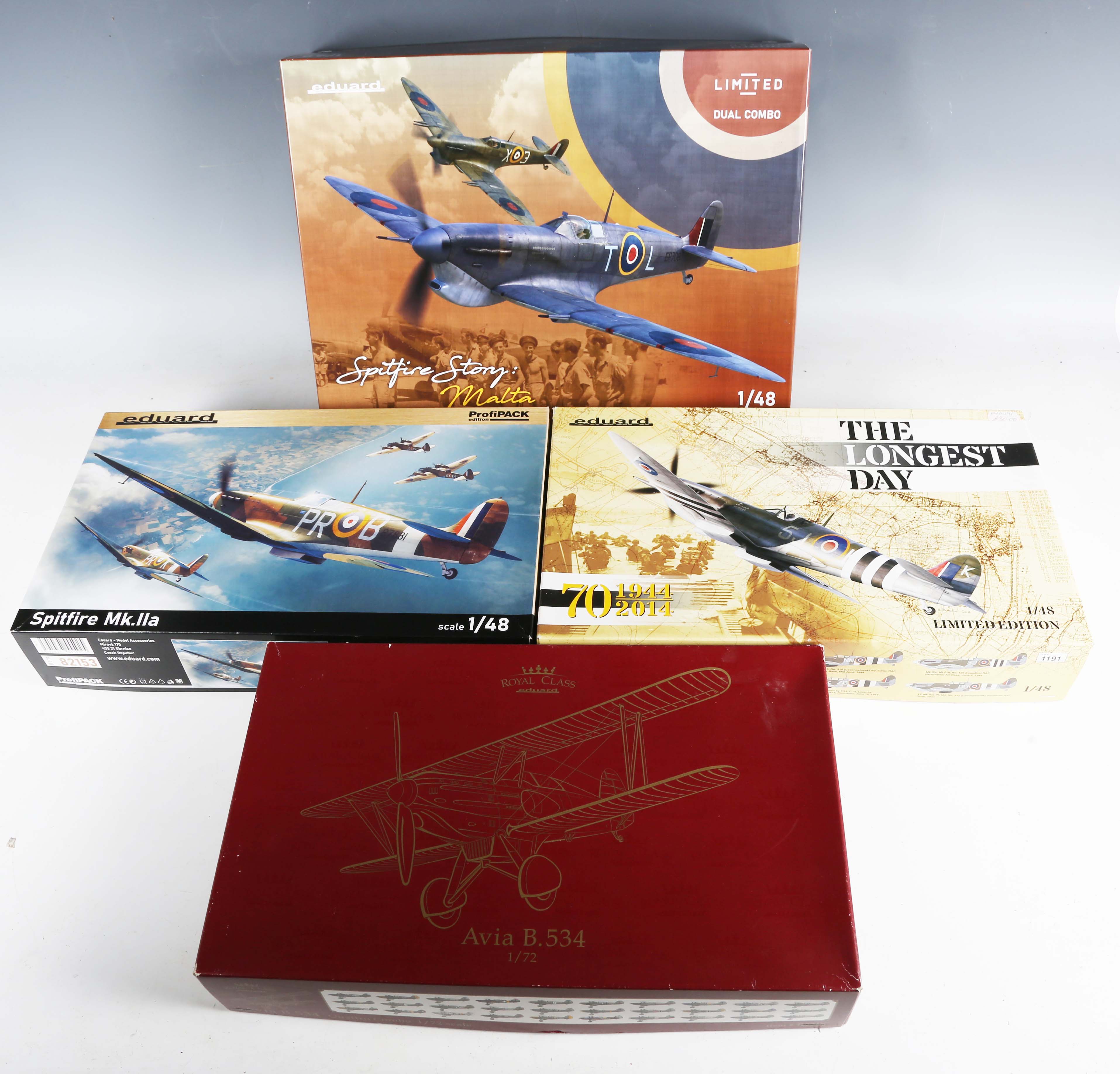 Four Eduard plastic model aircraft kits, comprising Spitfire Mk.IIa, The Longest Day Spitfire, dual combo Spitfire Mk.Vb/Vc In Defence of Malta 1942-1943 and Royal Class Avia B.534, all boxed.
