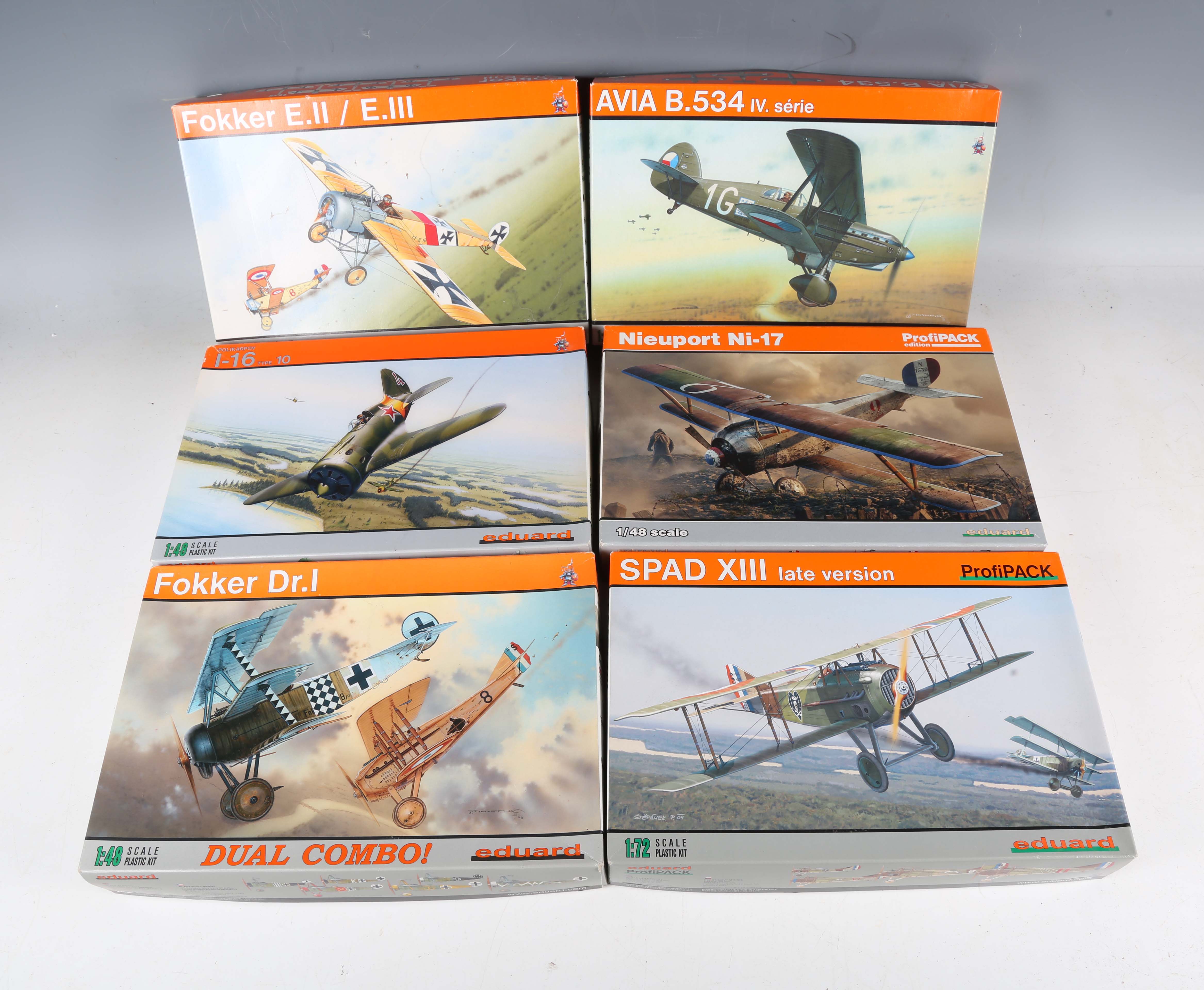 Sixteen Eduard plastic model aircraft kits, including BF110E, Hellcat Mk.I/Mk.II and Fokker Dr1, all boxed.