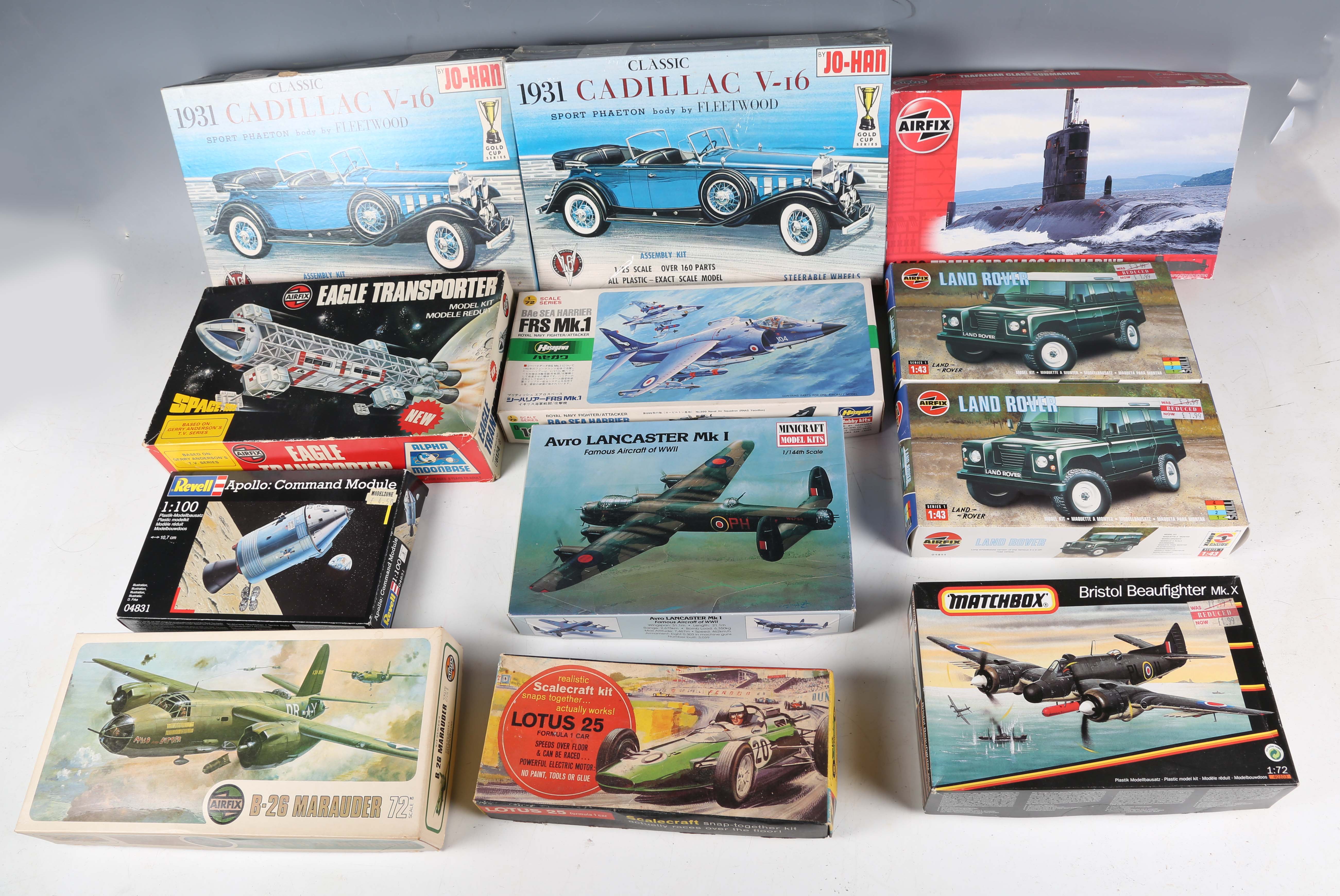 A group of plastic model kits, including Airfix Eagle Transporter, two Jo-Han 1931 Cadillac Sport Pheaton, Matchbox Bristol Beaufighter MK.X and FROG Fairey Firefly, all boxed (unchecked).