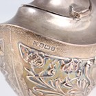 An Edwardian silver oval tea caddy with domed hinged lid and knop finial above scrolling tendril and stylized floral decoration, Sheffield 1907 by James Deakin & Sons, weight 96.3g, height 9.3cm.