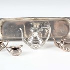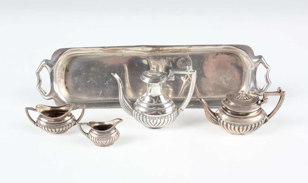 An Edwardian silver child's toy five-piece tea set of oval half-reeded form, comprising two-handled tea tray, length 15cm, teapot, hot water pot, two-handled sugar bowl and milk jug, Birmingham 1907 by Adie & Lovekin Ltd, total weight 35.6g.