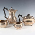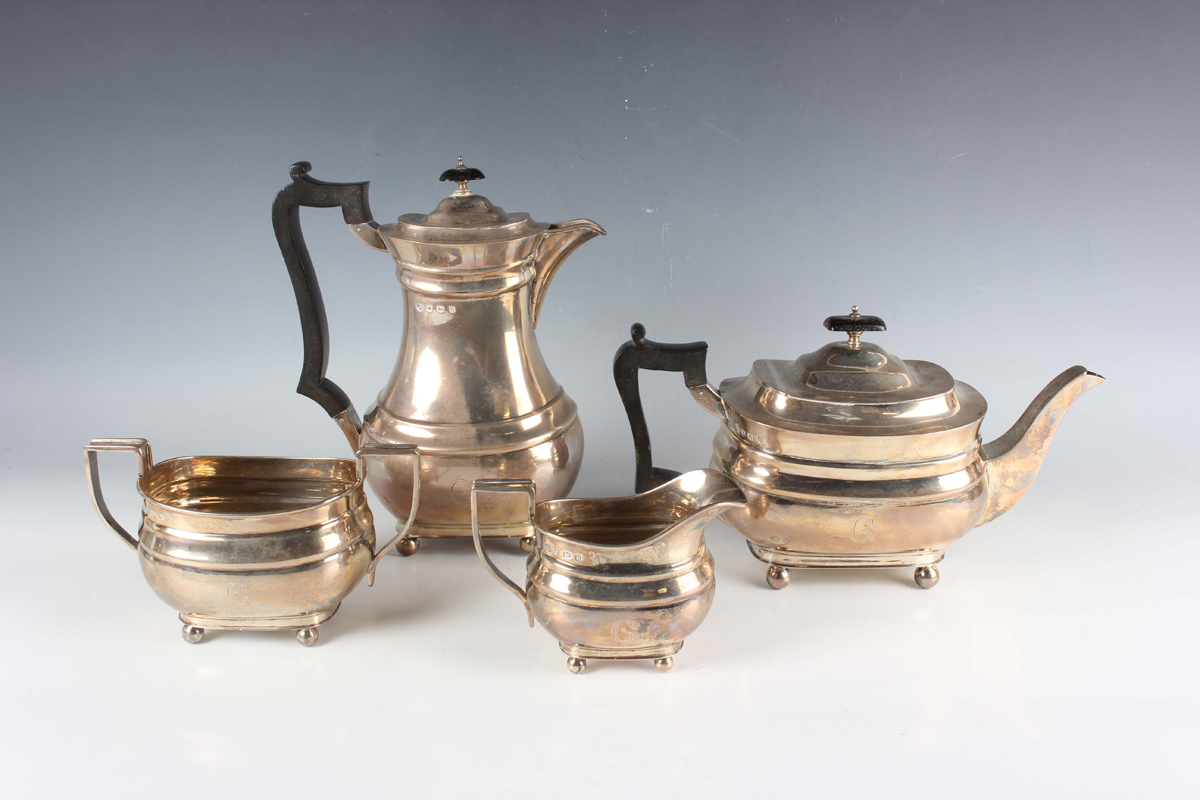 A George V silver four-piece tea set of cushion form on ball feet, comprising teapot, hot water pot, two-handled sugar bowl and milk jug, Sheffield 1930 by William Hutton & Sons Ltd, total weight 1917g, height of teapot 16cm.