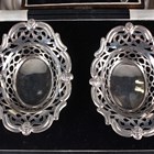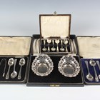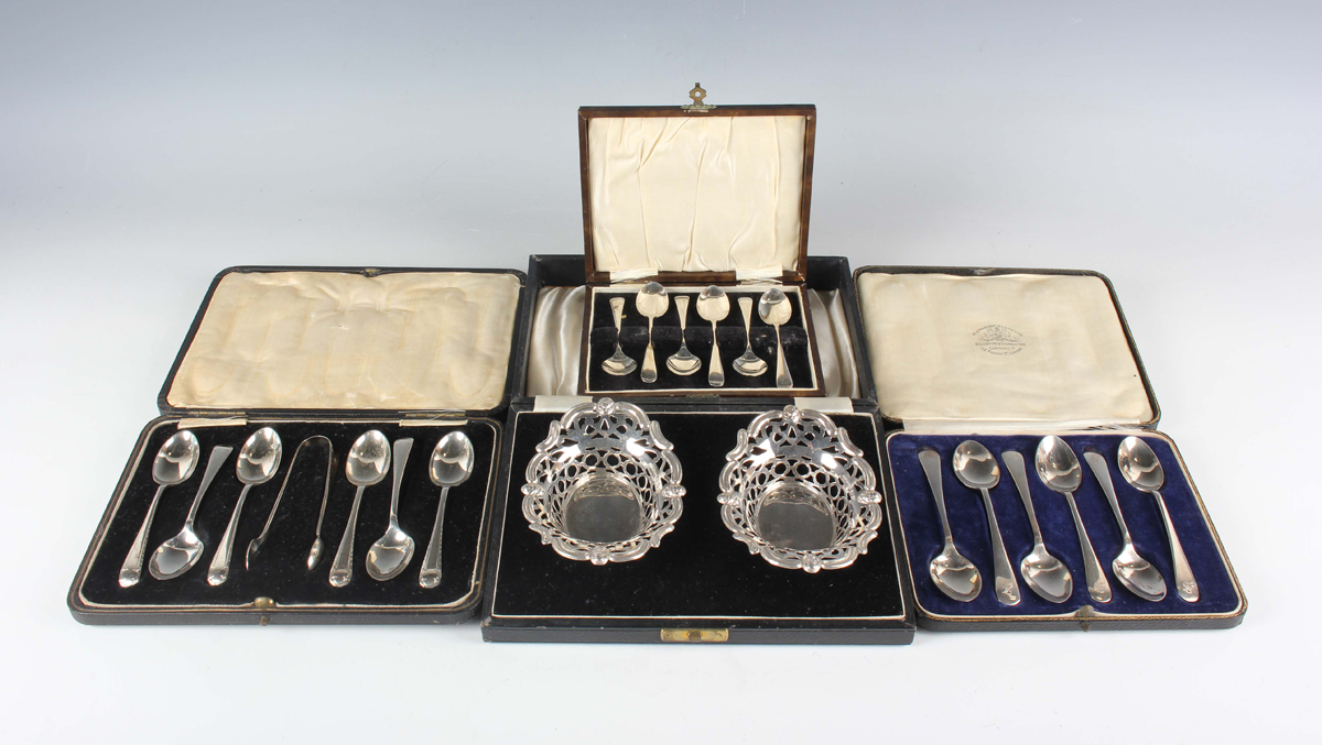 A pair of George V silver oval bonbon dishes, each pierced with mask and scroll sides, Birmingham 1932 by S.J. Levi & Co, length 11cm, cased, a set of six silver teaspoons and matching pair of sugar tongs, Sheffield 1928, cased, another set of six silver teaspoons, cased, and a set of six silver coffee spoons, cased, total weight 258.2g.