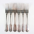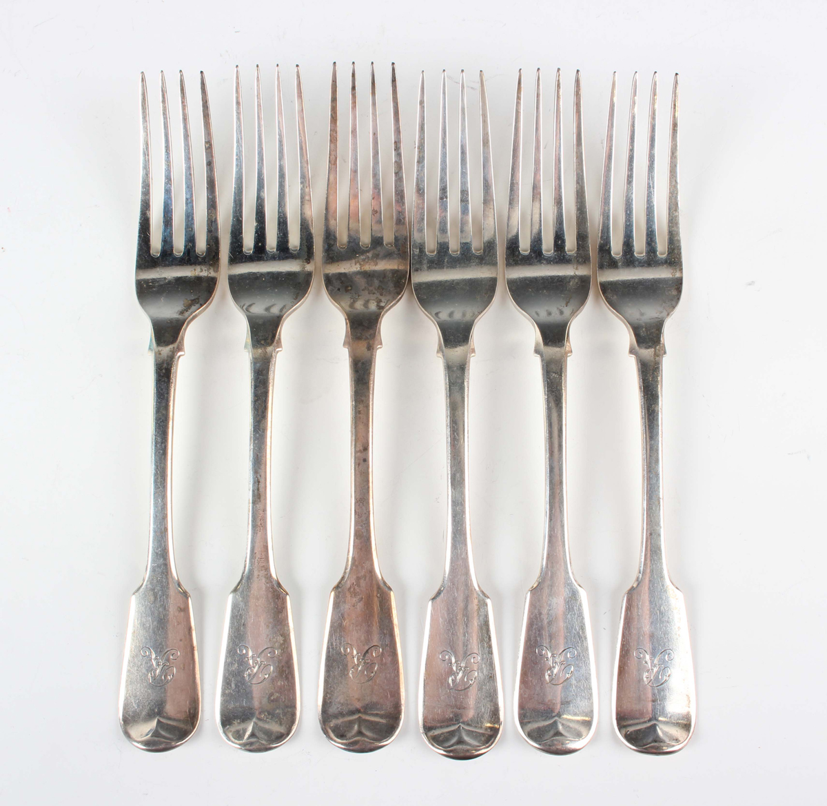 A set of six George III silver Fiddle pattern table forks, initial engraved, London 1818 by William Eley I & William Fearn, total weight 422g.