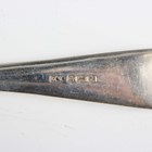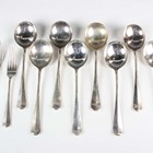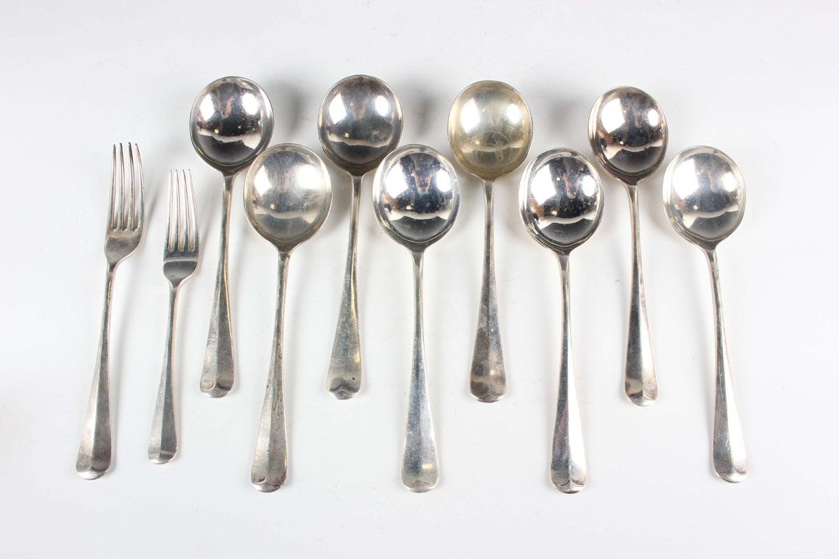 A set of eight silver Hanoverian Rat Tail pattern soup spoons and a matching table fork, Sheffield 1932-1936 by Viner's Ltd, and a matched dessert fork, London 1936 by Francis Higgins II, total weight 824.6g.