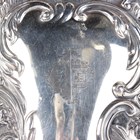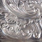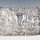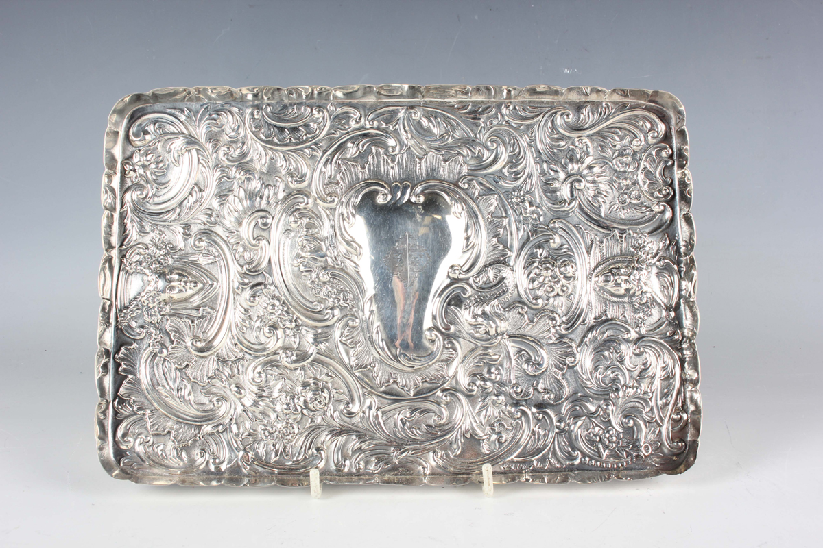 A late Victorian silver rectangular dressing table tray, engraved with a crest within an embossed surround of masks, flowers and foliate scrolls, London 1894 by William Comyns & Sons, weight 263.6g, length 26.3cm.