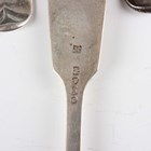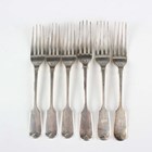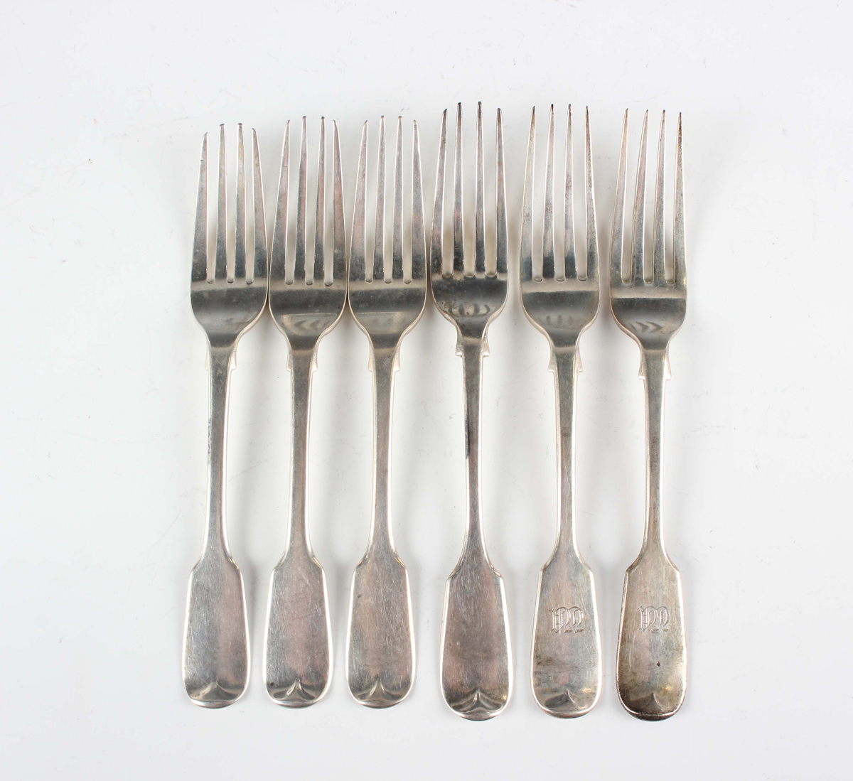 A group of six Victorian silver Fiddle pattern dessert forks, including three Exeter 1850 by William Rawlings Sobey, total weight 271.1g.