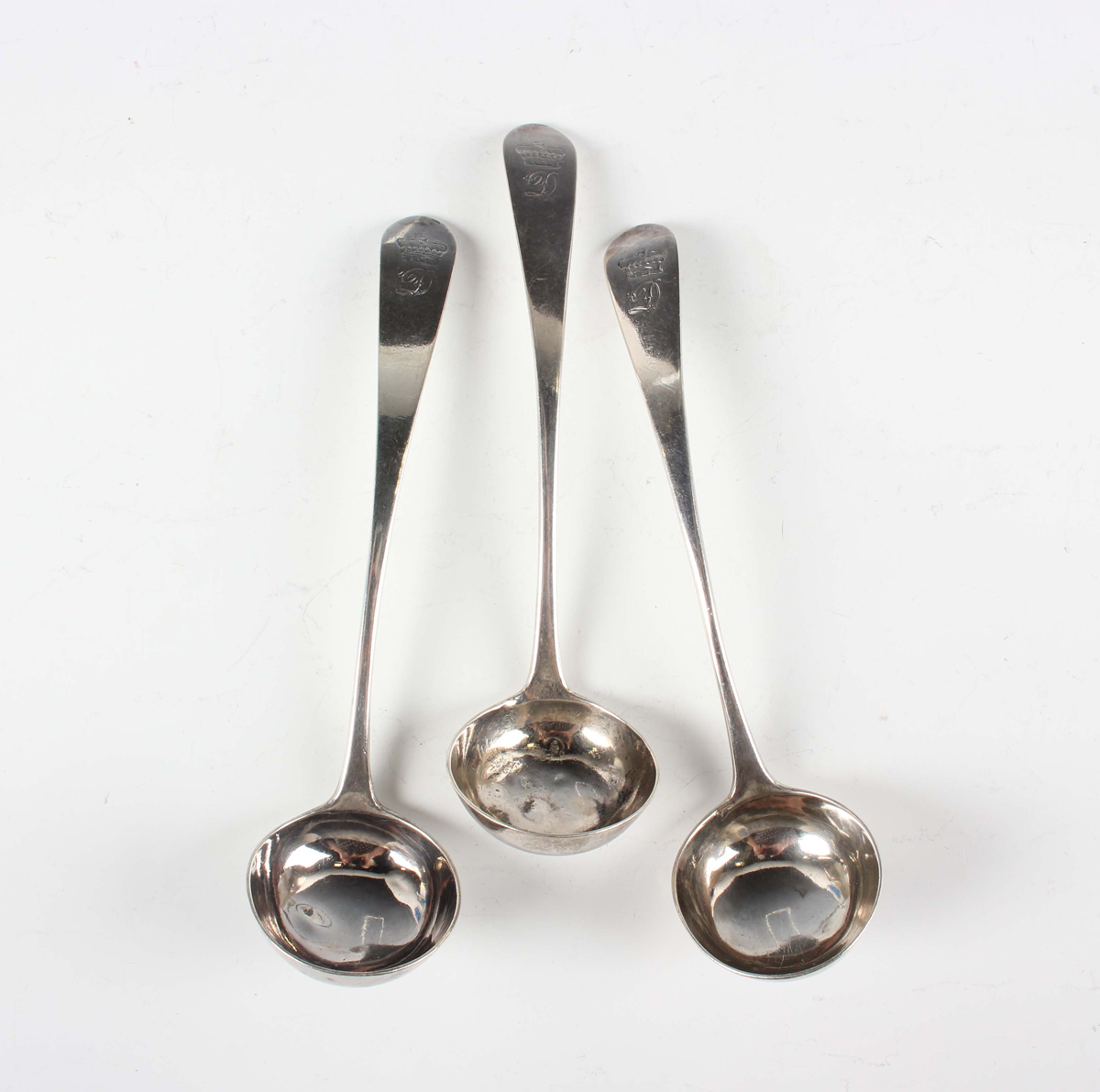 A set of three George III Scottish silver Old English pattern sauce ladles, Edinburgh 1804 by Alexander Henderson, total weight 80.2g, length 15.5cm.