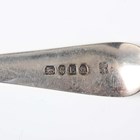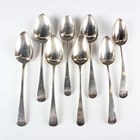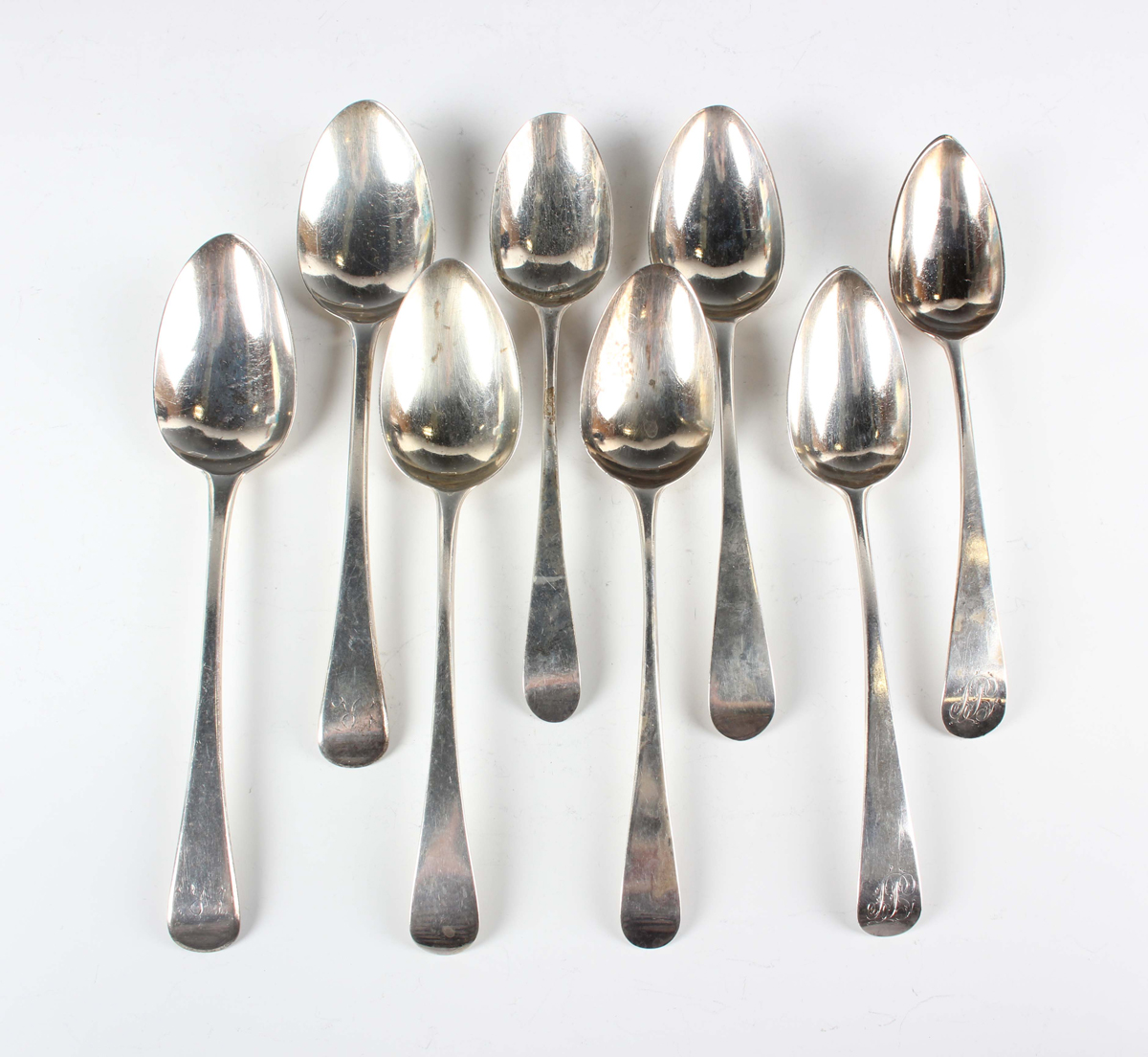 A pair of George IV silver Old English pattern serving spoons, London 1827 by William Bateman II, length 23cm, and six George III silver Old English pattern tablespoons, various dates and makers, total weight 490.7g.