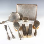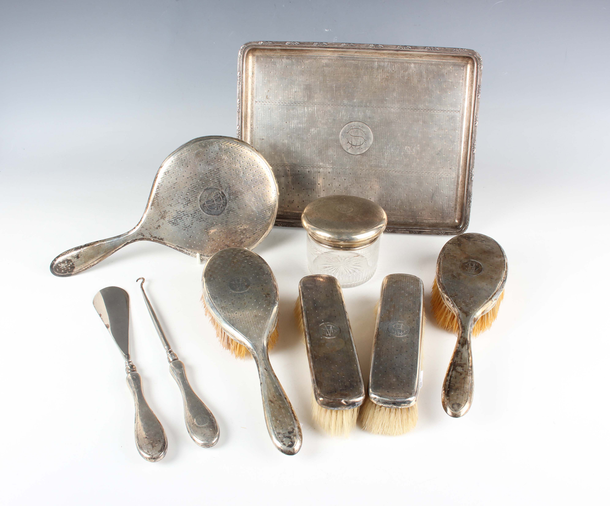 An Edwardian and later silver nine-piece dressing table set with engine turned decoration, comprising a rectangular tray, length 27.5cm, a hand mirror, two hairbrushes, two clothes brushes, a silver handled shoehorn and matching buttonhook, and a cut glass jar with a silver cover, London 1909, 1911 and 1912 by Mappin & Webb Ltd, weight of tray and cover only 506.6g.