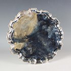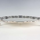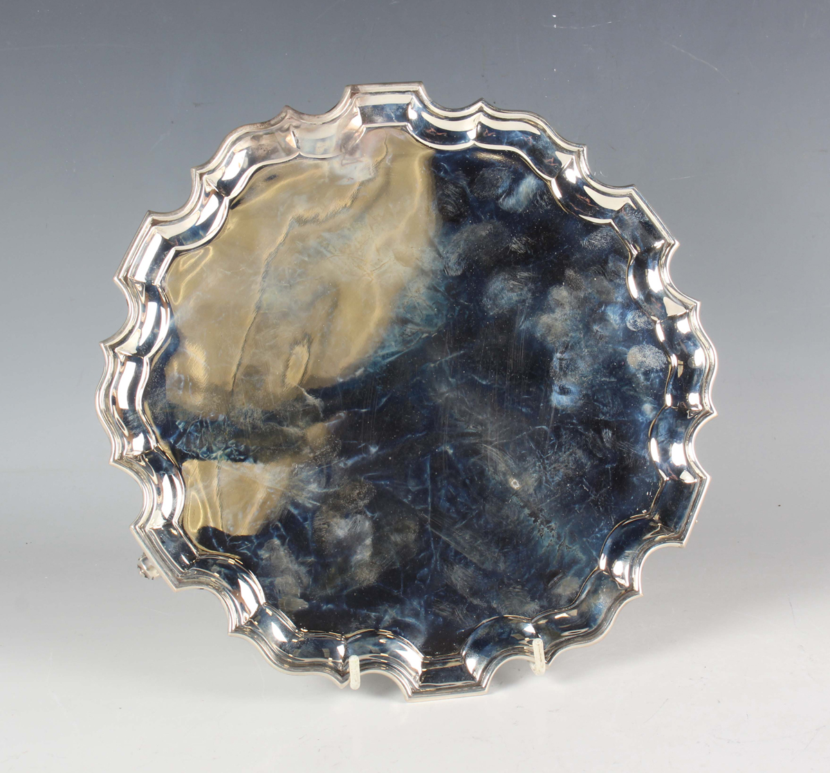 An Edwardian silver circular card salver with raised piecrust rim, on scroll feet, Sheffield 1908 by Fordham & Faulkner, retailed by Asprey London, weight 504.6g, diameter 25.7cm.
