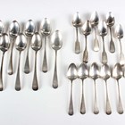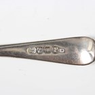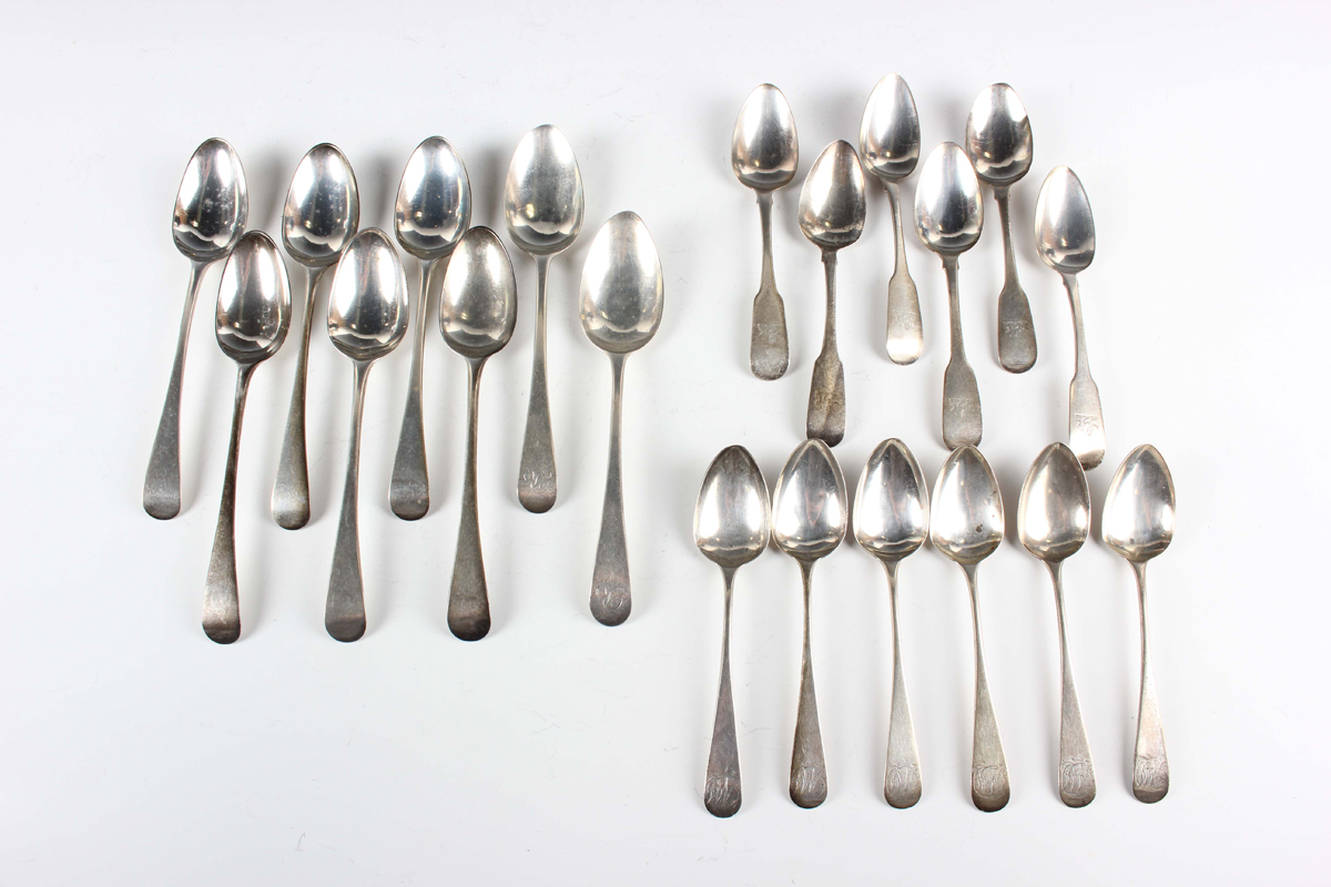A set of six George III silver Old English pattern dessert spoons, London 1788 by Richard Crossley, a set of six Irish silver Fiddle pattern teaspoons, Dublin 1821 by James Moore, a set of six silver Old English pattern teaspoons, Newcastle 1794, and a pair of silver Old English pattern dessert spoons, London 1811, total weight 451.8g.