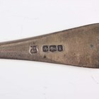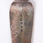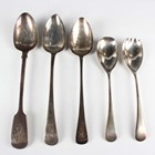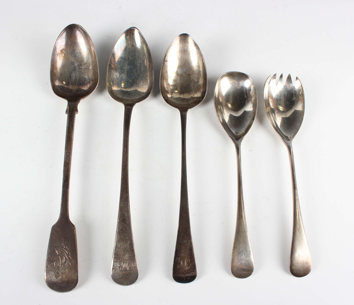 A George III silver Old English pattern basting spoon, London 1819 by Sarah Purver, length 29cm, another similar silver basting spoon, London 1813 by John Lambe, length 27.5cm, a Victorian silver Fiddle pattern basting spoon, London 1843 by Joseph & Albert Savory, and a pair of silver salad servers, Sheffield 1926, total weight 515g.