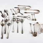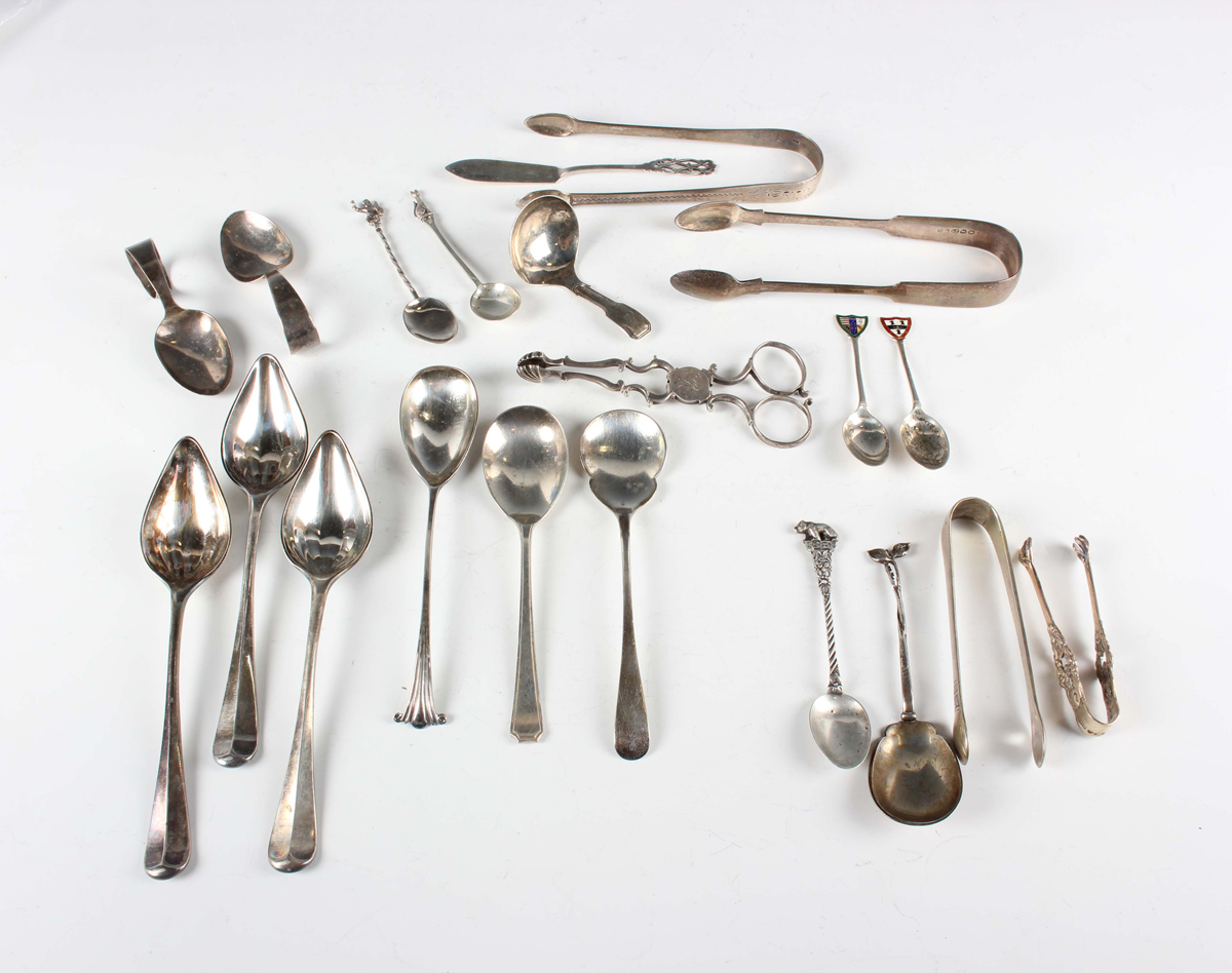 A small group of silver cutlery, including a Fiddle and Thread pattern caddy spoon, Birmingham 1826 by Joseph Willmore, two pairs of sugar tongs and a pair of sugar nips, total weight 388.2g, a pair of Swedish silver sugar nips, two .800 silver spoons and a pair of Middle Eastern sugar tongs.