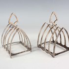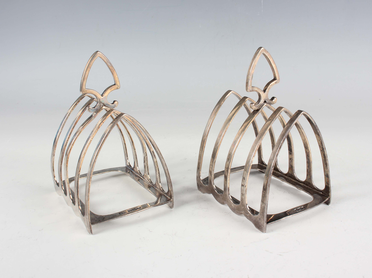 A pair of Edwardian silver four-division toast racks, each of arched form with matching handle, Sheffield 1909 by Harrison Brothers & Howson, total weight 226.2g, height 11.2cm.