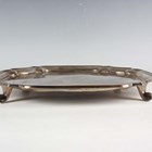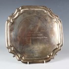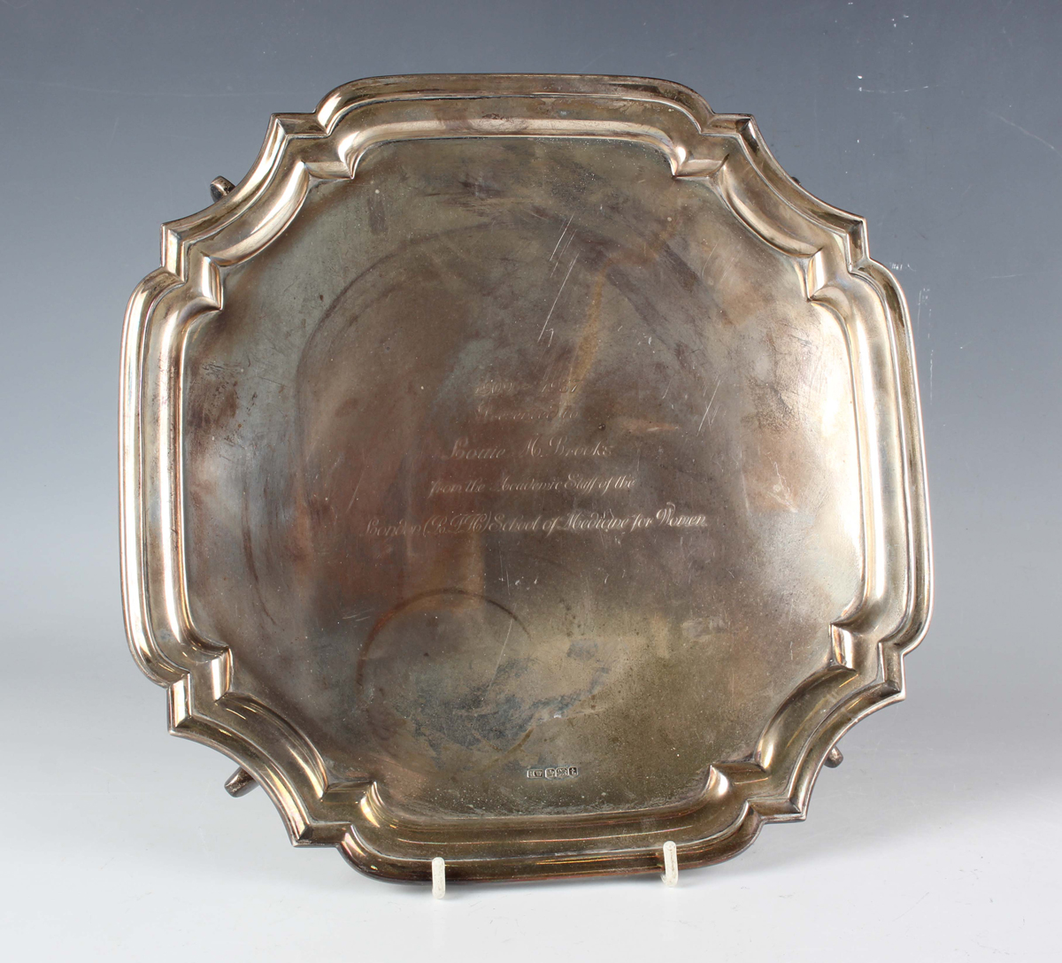 An Edward VIII silver canted corner square salver, presentation engraved within a piecrust rim, on scroll feet, Sheffield 1936 by Lee & Wigfull, weight 672.3g, width 26.5cm.