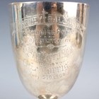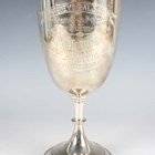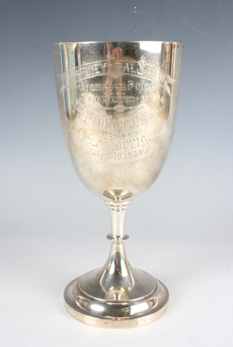 A late Victorian silver goblet, the ovoid bowl with engraved presentation inscription, on a beaded knop stem and circular foot, Sheffield 1899 by William Hutton & Sons Ltd, weight 251.6g.