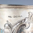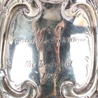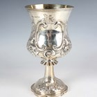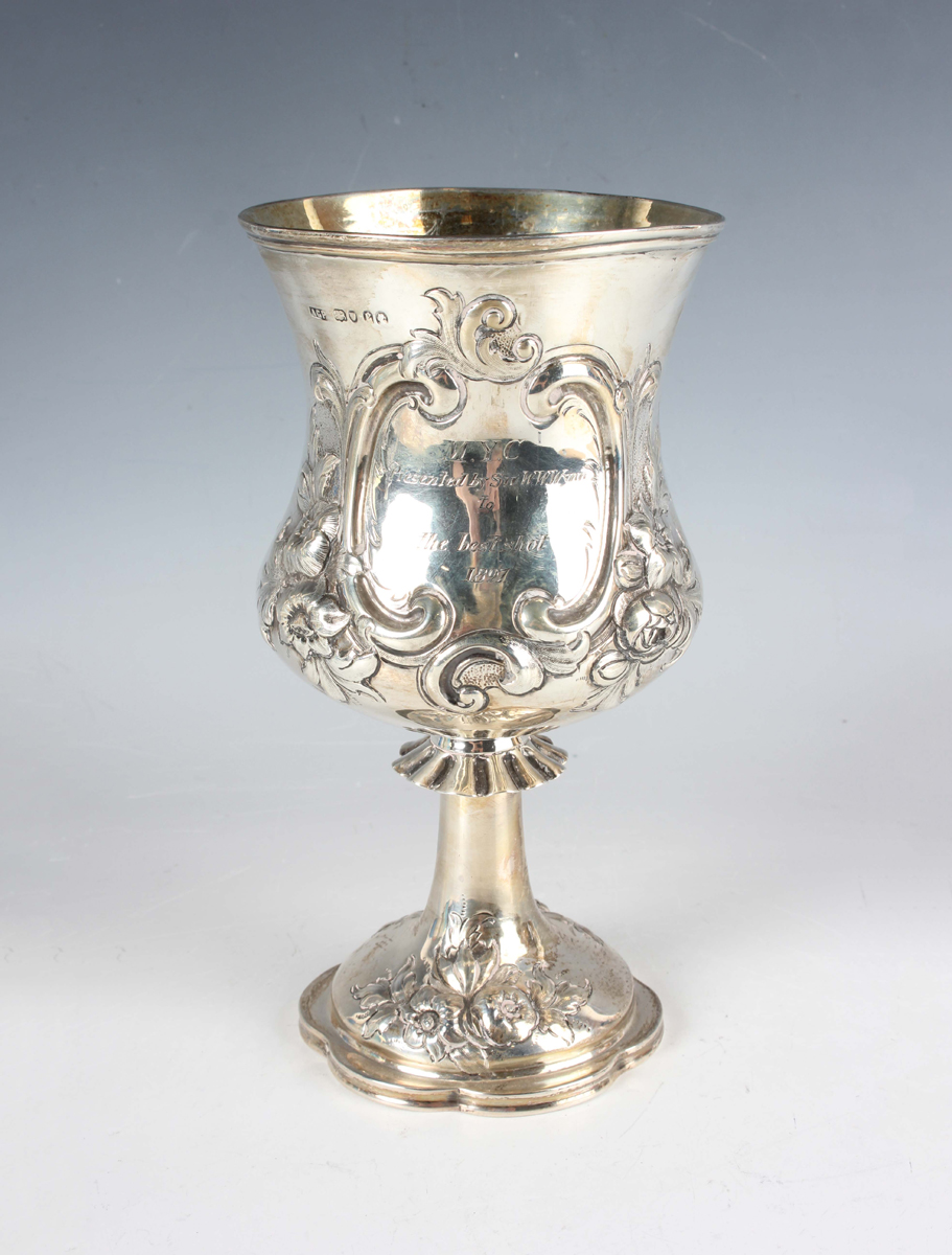 A Victorian silver goblet, the waisted urn shaped bowl embossed with flowers and scroll cartouches, one presentation inscribed, on a flared foot with lobed edge, London 1860 by Augustus George Piesse, weight 297.5g, height 20cm.