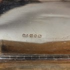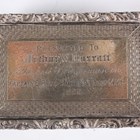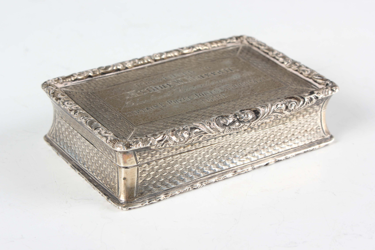 A late Victorian silver rectangular snuff box with engine turned decoration and cast foliate scroll borders, the hinged lid with engraved presentation inscription, Birmingham 1890 by George Unite, weight 99g, length 7.2cm.