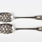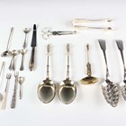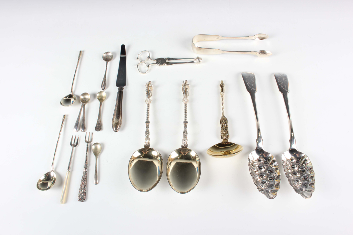 A pair of late Victorian silver apostle serving spoons, Sheffield 1892 by Martin, Hall & Co, length 19.7cm, a pair of silver Fiddle pattern tablespoons, each later embossed with fruit, London 1813 by Peter & William Bateman, and a small collection of other silver, including a pair of Russian spoons, a pair of sugar nips and a pair of sugar tongs, weighable items 457g.