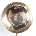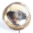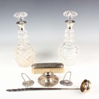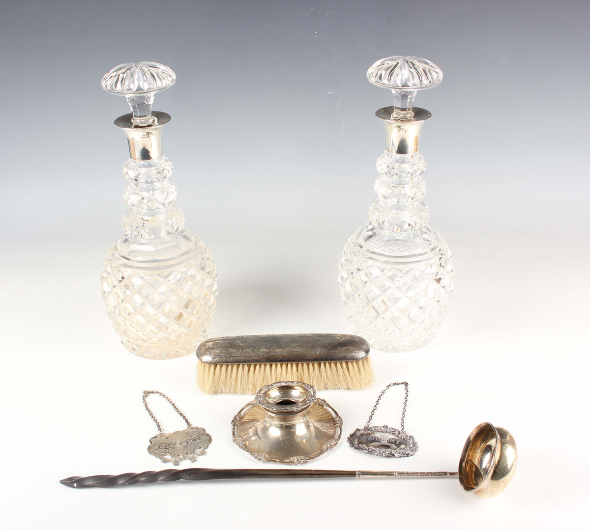 A pair of Edward VIII cut glass mallet shaped decanters and stoppers, each fitted with a silver collar, London 1936 by Mappin & Webb Ltd, height 29.5cm, a silver punch ladle with twisted whalebone handle, the circular bowl inset with a George III threepence 1763, a silver inkwell, a silver 'Sherry' decanter label, another 'Sherry' decanter label, unmarked, and a silver clothes brush.
