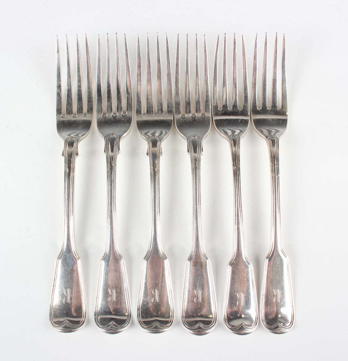 A matched set of six George III and later silver Fiddle and Thread pattern table forks, London 1797, 1798 and 1850, various makers, total weight 441.9g.