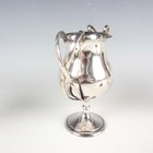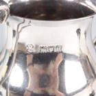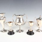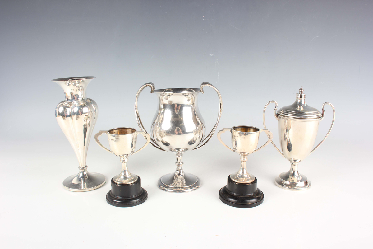 A George V silver trophy cup, the tulip shaped bowl flanked by scrolling crossed handles, on a tapering knop stem and circular foot, London 1911 by Charles Boyton & Son Ltd, height 14cm, a silver two-handled trophy cup and cover, Sheffield 1929, height 14cm, a pair of small two-handled trophy cups, Chester and Birmingham 1929, each with an ebonized plinth, total weight 328g, and a silver specimen vase of tapering lobed form, London 1905, height 14.3cm.