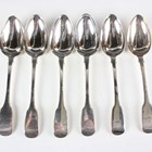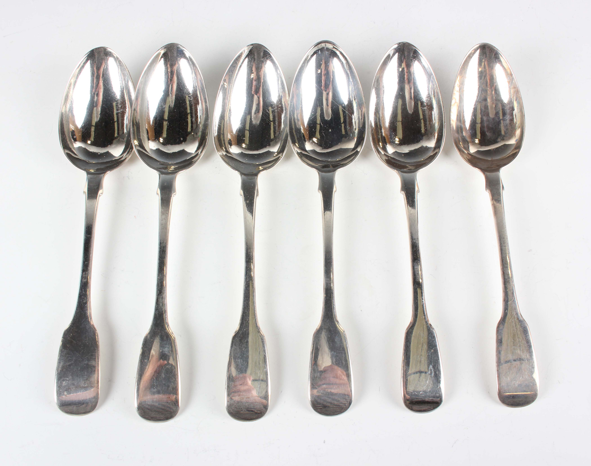 A set of six early Victorian silver Fiddle pattern tablespoons, London 1837 by John Harris IV, total weight 428g, length 22cm.