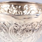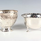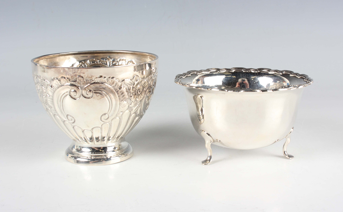 A late Victorian silver circular half-reeded sugar bowl, embossed with flowers and 'C' scrolls, on a circular foot, Birmingham 1900, height 7cm, and another silver sugar bowl with cast wavy rim, on scroll legs, Birmingham 1927, height 5.5cm, total weight 123g.