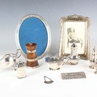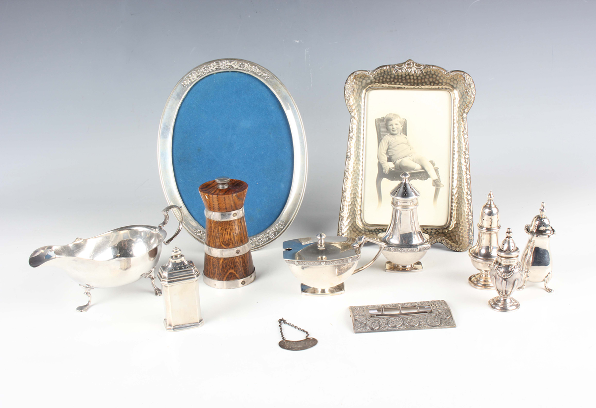A small group of silver, including a sauceboat, London 1906 by Mappin & Webb, a mustard and matching pepper caster with cast Celtic decoration, a rectangular buckle with engraved scroll decoration, Chester 1886, length 8.4cm, and a 'Whiskey' decanter label, Birmingham 1927, total weight 438g, together with a Continental silver oval photograph frame, a plated photograph frame and a plate mounted oak pepper mill.