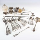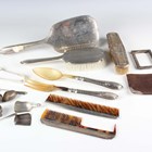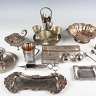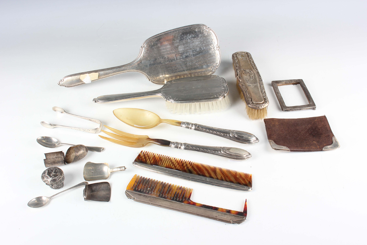 A small group of silver, including dressing table items and a pair of sterling handled salad servers, weighable items 66.4g, together with a group of plated items, including a four-egg cruet stand and spoons, a pair of candle snuffers and a chamberstick.