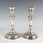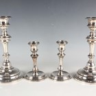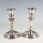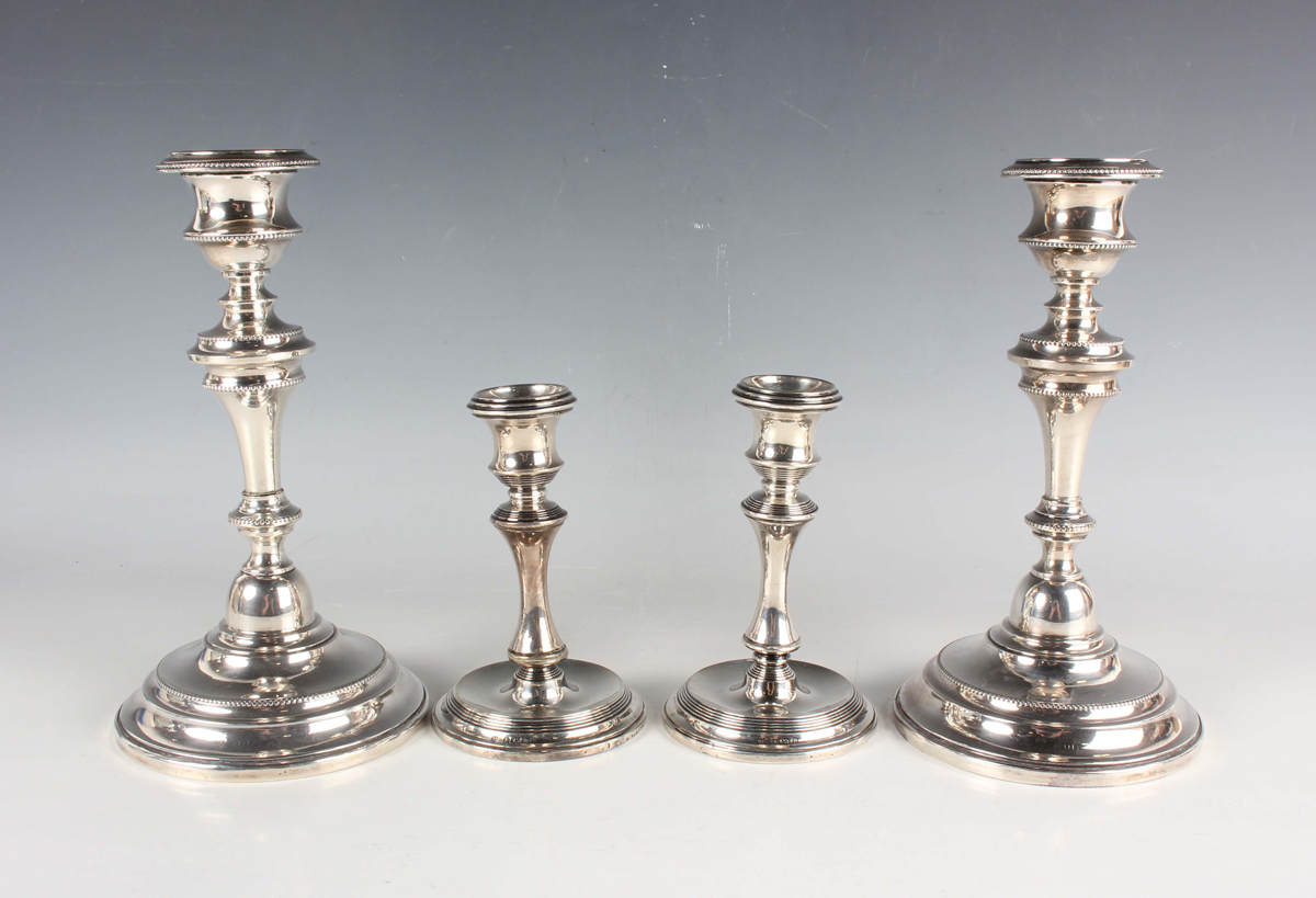 A pair of George V silver candlesticks, each of baluster form with a detachable nozzle and beaded decoration, on a circular base, London 1928 by Charles Boyton & Son Ltd, height 21cm, and a smaller pair of silver candlesticks with reeded decoration, Birmingham 1912 by William Neale & Son, height 12.5cm.