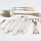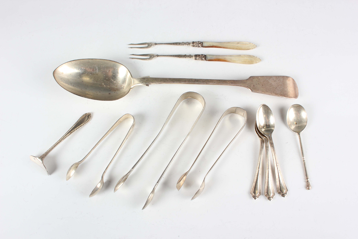 A Victorian silver Fiddle pattern basting spoon, London 1871 by George Adams, length 30.5cm, a pair of silver Fiddle and Thread pattern sugar tongs, London 1806, two other pairs of silver sugar tongs and a small group of other silver cutlery, weighable items 307g.