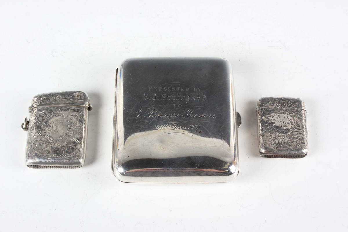 A late Victorian silver rectangular cigarette case, presentation engraved, London 1893 by Sampson Mordan & Co, length 9.5cm, and two silver vesta cases, each with engraved decoration, total weight 187g.